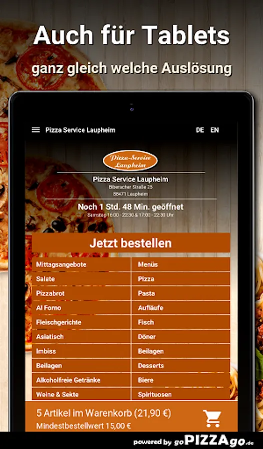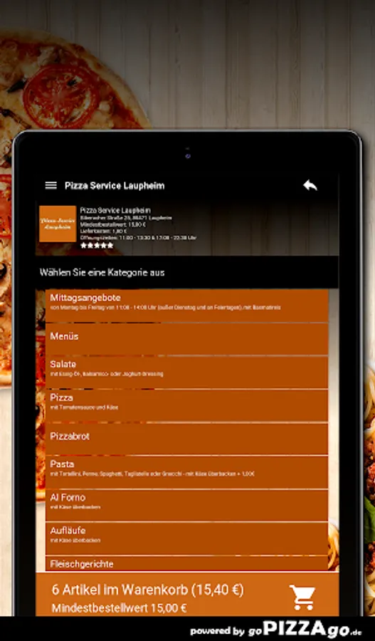 You can order a large selection of dishes from our pizza service and have them delivered to your office or home. We offer 174 dishes varied dishes, a selection: pizza specials, doner kebab plates, pizza chicken. During the lunch break you can of course also have lamb bhuna (€ 8.10), lamb sagwala (€ 8.90), mattar panner (€ 7.10) delivered cheaply at Pizza Service Laupheim in Laupheim. We also have an ample selection of drinks in our range: Mezzo Mix, Coca-Cola light, Coca-Cola. Our most popular specialties areWe deliver at these times