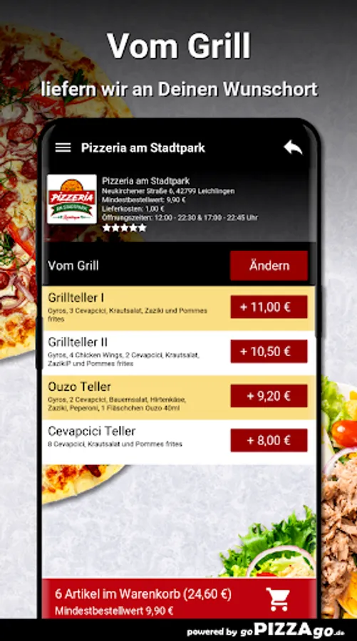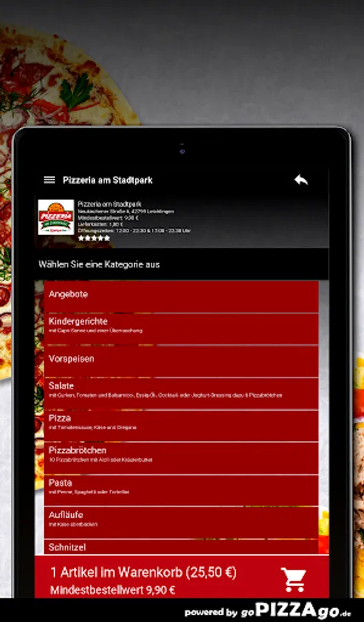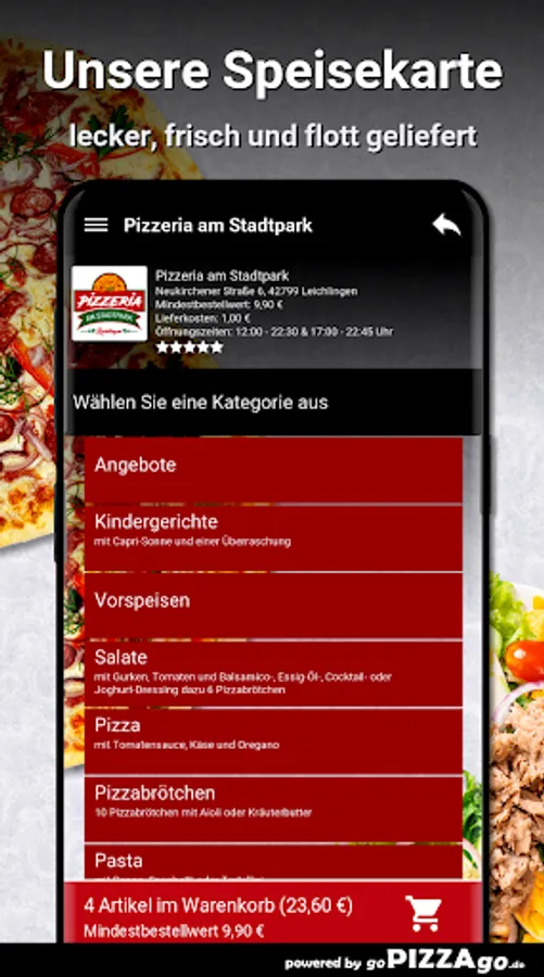 You can order tasty and fresh foods quickly and easily from our delivery service Pizzeria am Stadtpark in Leichlingen and have them delivered. In our menu you will find 213 delicious dishes such as tzatziki for EUR 1.50 or schnitzel Berner-style for € 9.20. We continue to deliver drinks like Mezzo Mix, Fanta, mineral water. Also look at the food for boys and girls, such as Happy Kiddybox 4, Happy Kiddybox 2, Happy Kiddybox 1. Our popular items are the delivery times of Pizzeria am Stadtpark