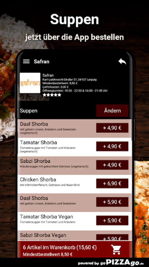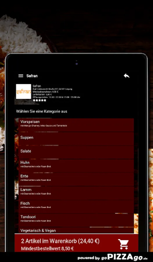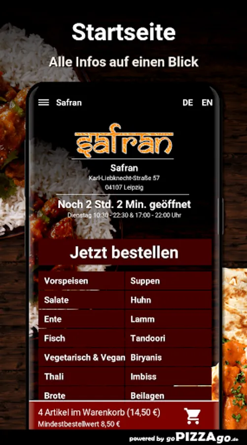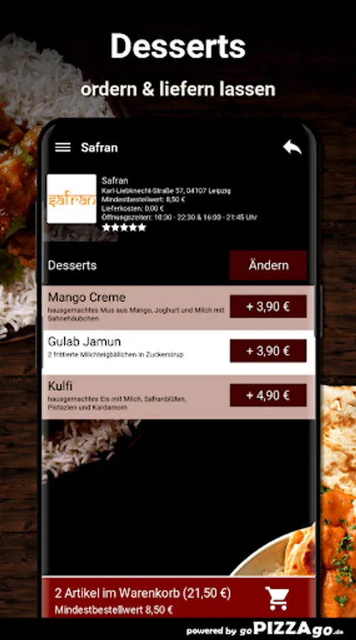 Of course, you can quickly order saffron from our delivery service from many delicious dishes in our online shop and maybe have it brought to the office or home. You will find 156 delicious dishes in our online menu. We also have a large selection of drinks on the menu: Lychee Lassi, Banana Lassi, Lassi Salty, Peach-Orange Lassi. The popular top sellers When we deliver your dishes