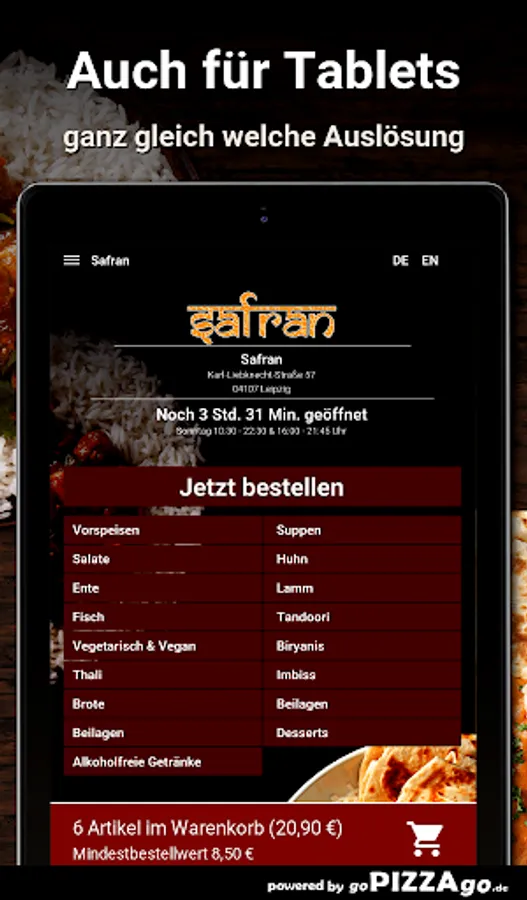 Eat delicious Indian food? Highly recommended for the delivery service in Leipzig The good and fresh Indian cuisine is always a tasty event. With 87 varied dishes, we offer an excellent range. Jheenga Curry can be ordered online, Murg Tikka Masala for an amazing € 11.90, Aloo Matter Vegan is delivered at a price of € 10.90, Batak Vindaloo with basmati rice or naan bread is delivered to your home, Jheenga Biryani is available online for only for € 13.90, Rahn Masala for an amazing € 13.90.