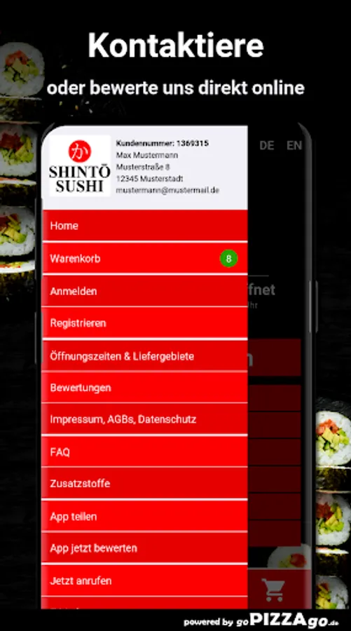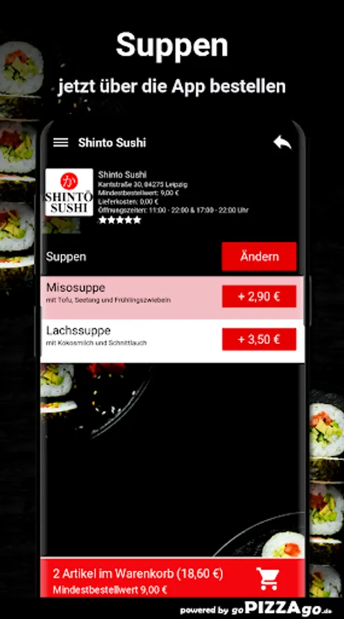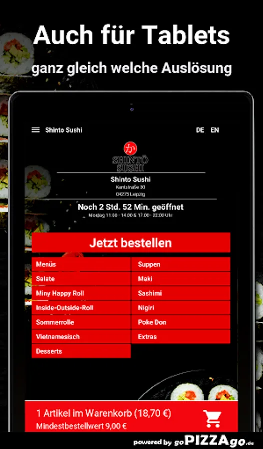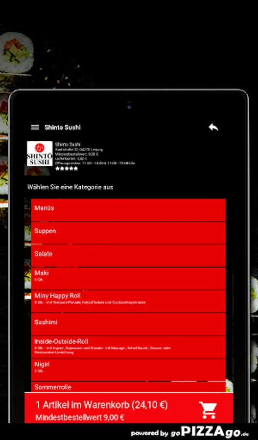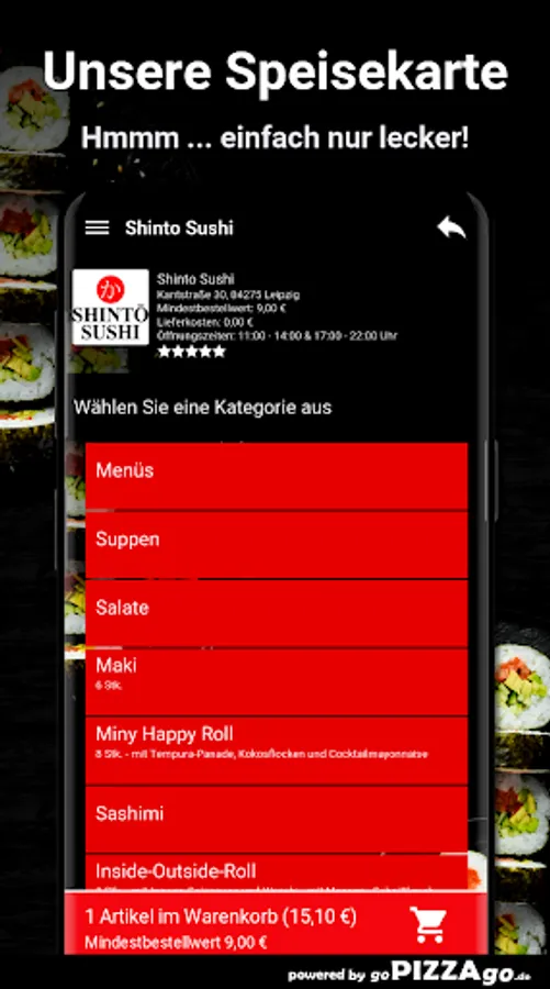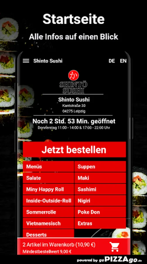 You can order freshly prepared food quickly and conveniently online from our Shinto Sushi delivery service in Leipzig. You will find 92 dishes and drinks in our online menu, such as 8 Sashimi Tuna, Summer Roll Salmon Tempura, Ebi Tempura Roll, 6 Ebi Tempura, Maki Unagi, Sake Don.What do people order? You can order food at these times