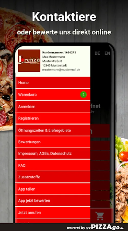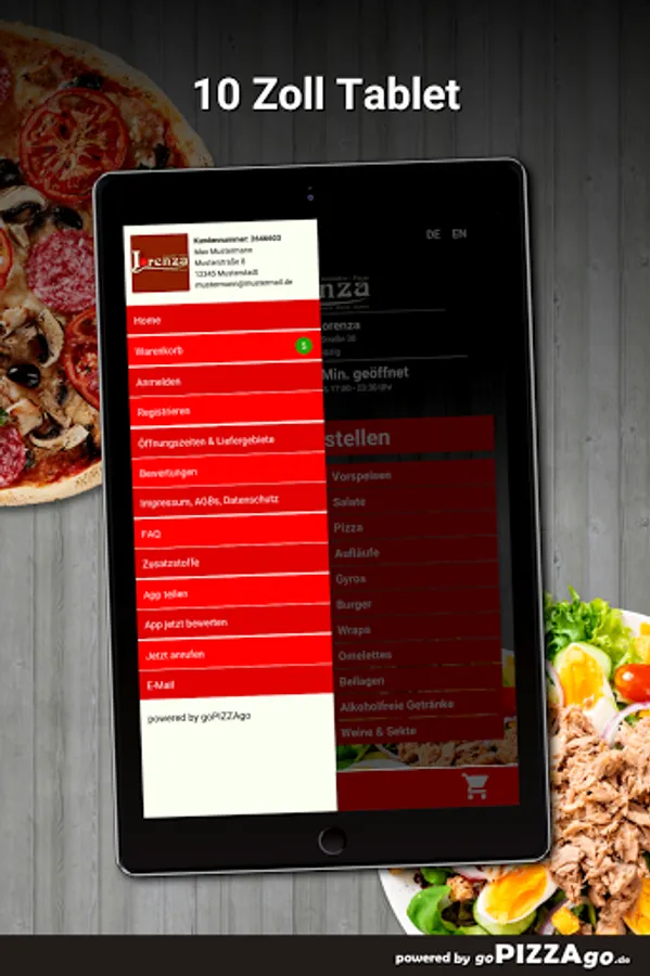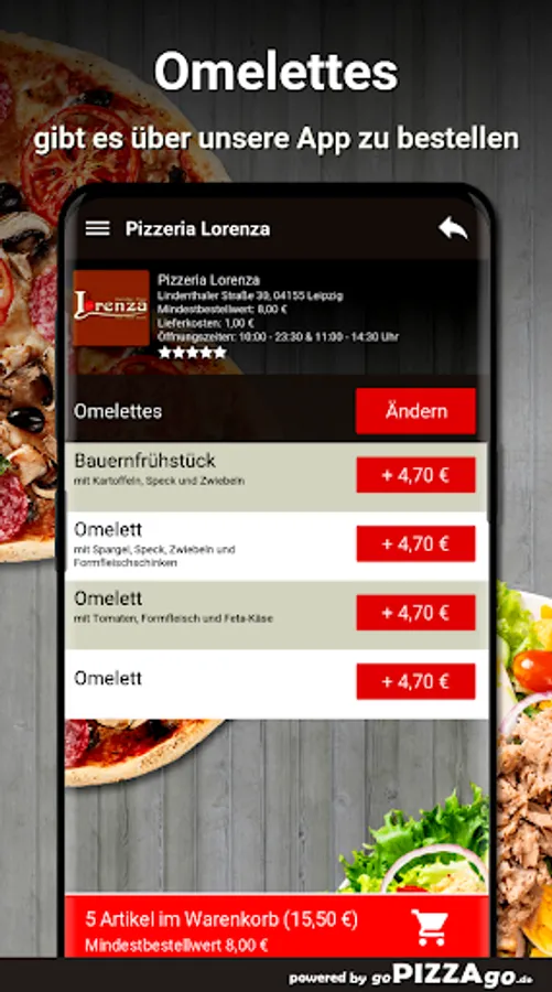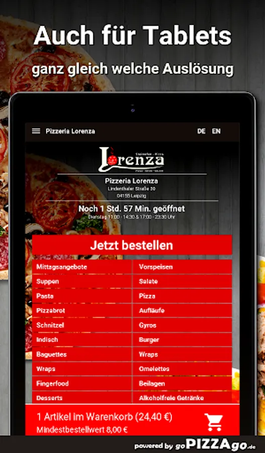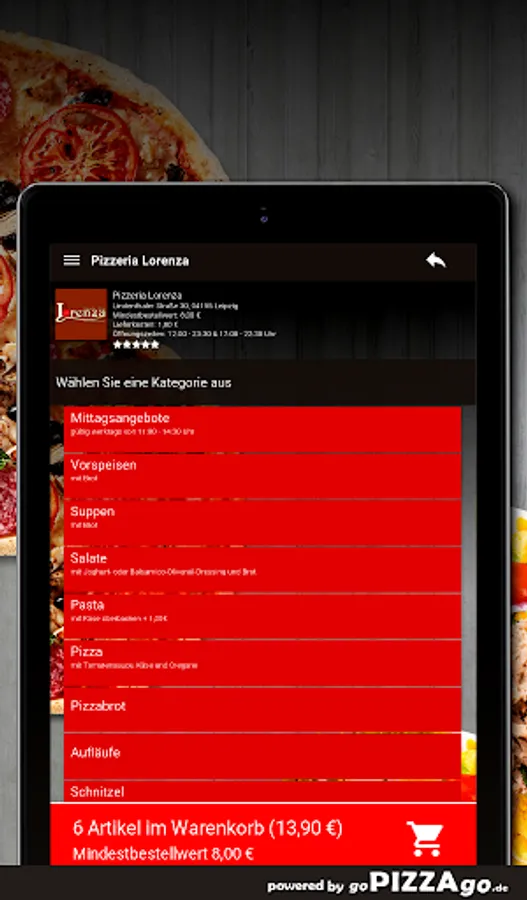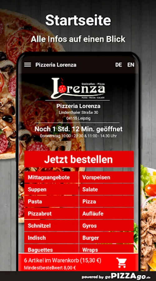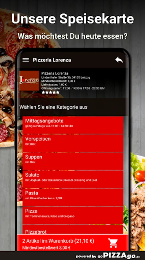Leckeres ... richtig frisch zubereitet, kannst Du bei unserem Lieferservice Pizzeria Lorenza hier sicher bestellen. Wähle aus einem Angebot von 220 Gerichte wie Kartoffelecken, Fischstäbchen mit Remoulade, Schnitzel mit 4 Sorten Käse, Pizza Quattro Formaggi sowie auch Kartoffelecken für 2,70 €. Wir bieten auch günstige Mittagsangebote: 1 indisches Gericht (EUR 7,20), 1 Gyrosgericht (Euro 7,50), 1 Calzone (€ 6,90), 1 Auflauf (€ 6,50). Als Nachspeise bieten wir: Tiramisu, Ben & Jerry's Strawberry cheesecake, Pana Cotta, Käsekuchen, Ben & Jerry's Cookie dough.Pizzeria Lorenza Top-7Essen bestellen können Sie zu diesen Zeiten