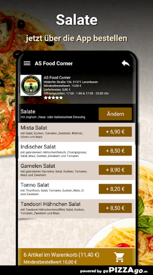 Whet your appetite: Pizzas from AS Food Corner in LeverkusenOur pizzas are always a highlight. With 26 pizzas, we offer you an ingenious selection. Pizza salami is offered online here for just €6.90 to €11.90, you can get broccoli pizza for €6.30-11.20 quickly and easily, absolutely crispy pizza Pizza Calzone II is delivered to you for €8.00- €11 or pizza ham with cheese, tomato sauce and oregano can be delivered to your home for €6.90-11.90.