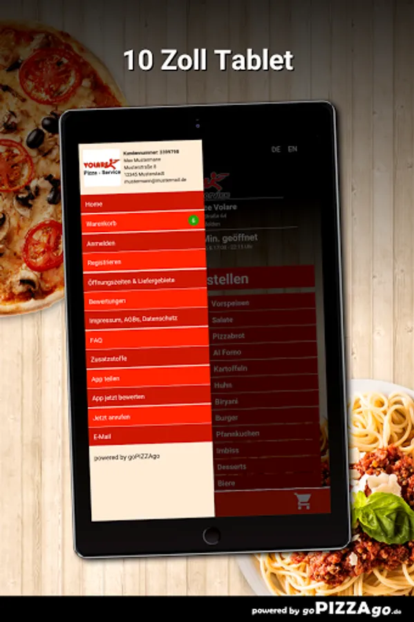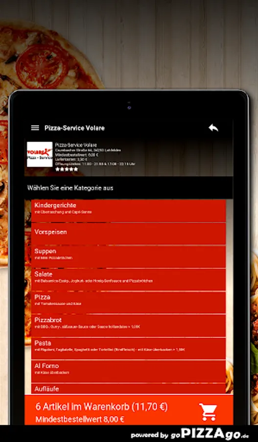 Of course, you can order and have it delivered quickly and easily in our online shop with a large number of feasts at the delivery service Pizza-Service Volare (34253 Lohfelden). We have 266 food or drinks (Flammkuchen Pizza Gyros, Apple Strudel Vanilla Sauce, Veggie Burger, Baked Potato, Pizza Curry India, 20 Chicken Wings or Pizza Curry Volare for 9.95 euros). Also order drinks: Mezzo Mix, Mango Lassi, Fanta, Coca-Cola, Sprite, Rosa Lassi. Girls and boys can choose from numerous freshly prepared dishes such as pasta Bolognese for EUR 5.90, chicken nuggets mayonnaise for € 5.90, ham mini pizza for € 5.90, chicken nuggets ketchup for € 5.90, Children's dish Pasta Napoli for € 5.50, children's dish Mini Pizza Salami for € 5.90.What are our top sellers When does Pizza-Service deliver Volare?
