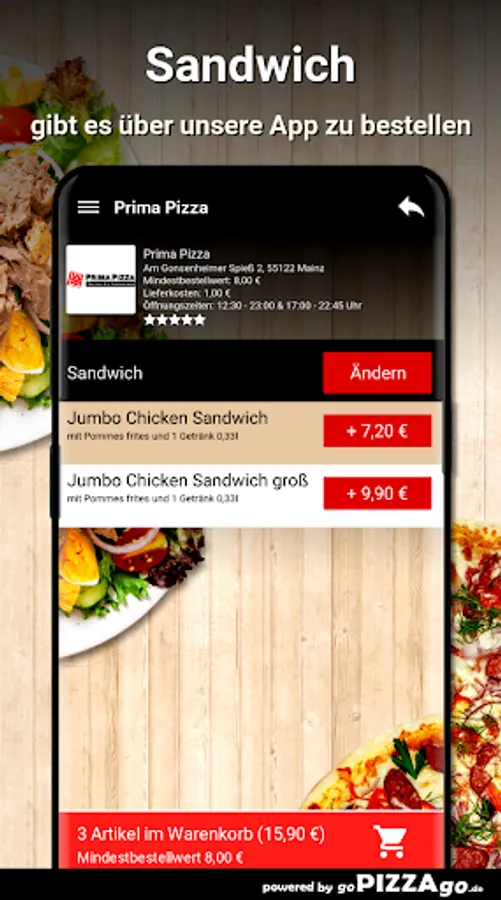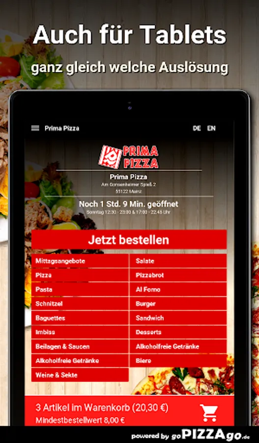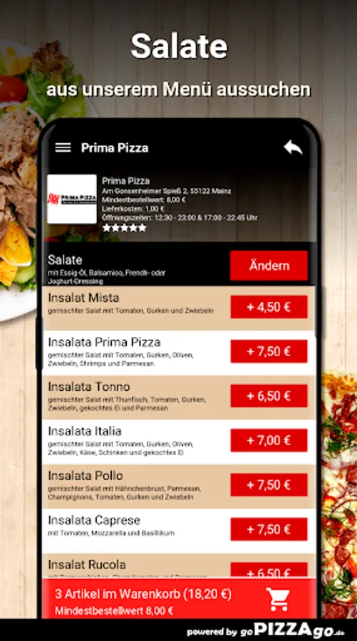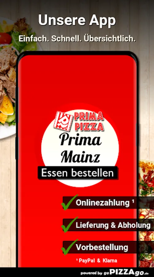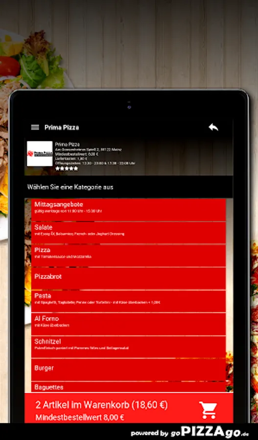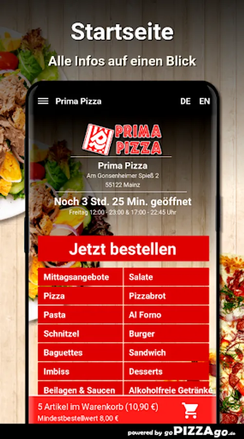 You can order tasty, mouth-watering food quickly and securely online from the Prima Pizza delivery service (Am Gonsenheimer Spieß 2 in Mainz) on this homepage. With us you have a selection of over 139 varied dishes (Pizza Bianca, Lasagne Bolognese, Pizza Rucola, Pasta Tonno, Cream Schnitzel or Pizza Cappriciosa for € 10.50). We also have a lunch menu for you with meals such as pizza lunch