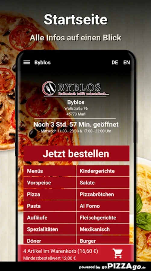 Welcome to Byblos in Marl! Are you hungry for starters, pizza, pasta, Mexican, Al Forno, casseroles, sandwiches, salads to be delivered or picked up?