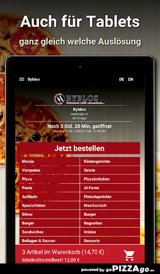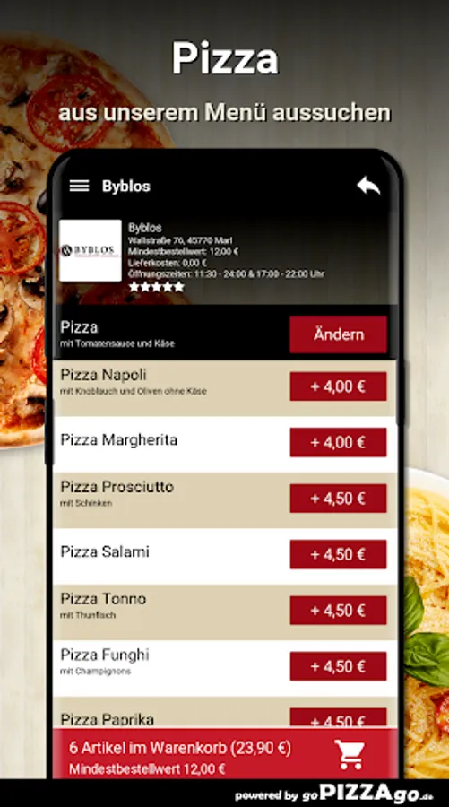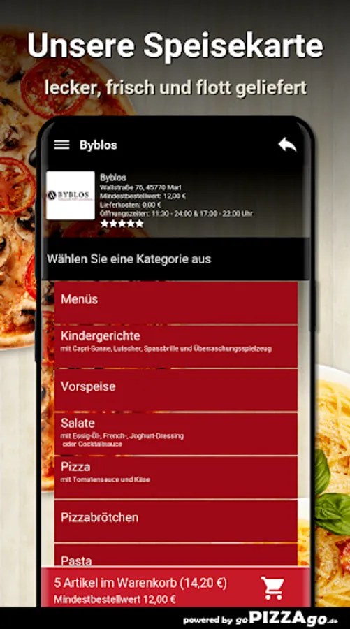 With the Byblos delivery service, Italian cuisine has more than pasta, pizza and risottos. Fresh Italian dishes are of course also available here in Marl. Pizza Gamberi is delivered at a price of 5.50-21.00 €, Pizza Salmon with Spinach and Gorgonzola can be delivered to your home for 7.00-26.00 €, Pizza Amer is available here online for only 6, € 50-23.00 to pick up or deliver, Pizza Carcofini is brought to you for 4.50-17.00 €, Pizza BBQ, excellent Pizza Vegetaria from 6.50-23.00 €, Macaroni al Forno is available to you Home delivery for € 7.90 and Pizza Diavolo can be ordered for € 6.00-23.