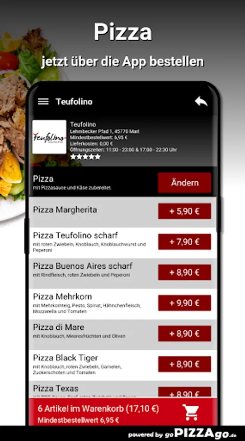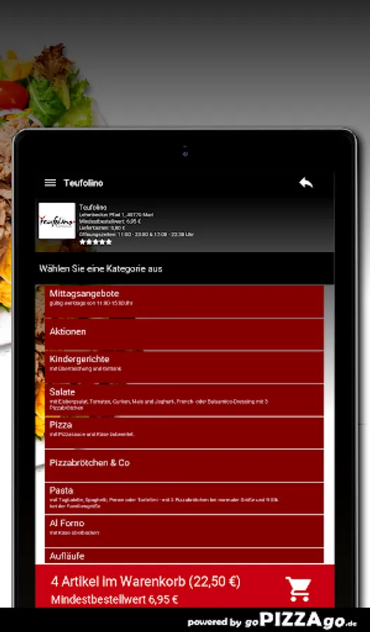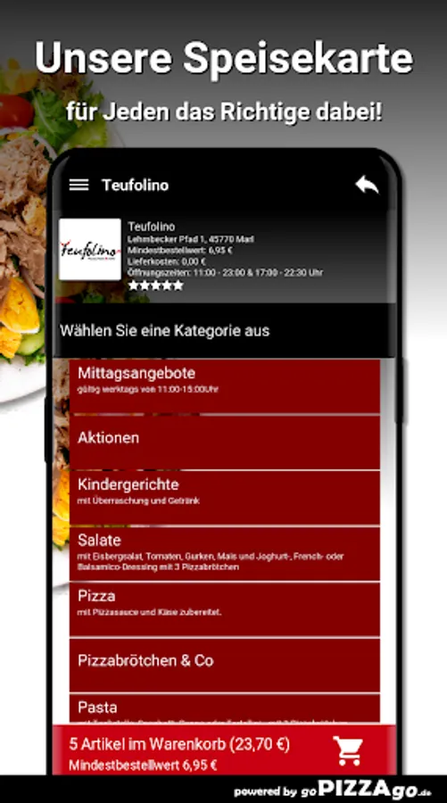 You can order many goodies in our online shop from our Teufolino delivery service online and have them delivered promptly. The range of our varied dishes includes 133 meals or drinks, pizza hot dog, pizza double-decker, pizza chili cheese. The offspring can order very inexpensive goodies such as the kids menu spaghetti carbonara, kids menu finger food, kids menu pizza, kids menu spaghetti Bolognese. Our kitchen also has a lunch menu such as Pasta Sizilia, Pizza Tuna, Salat Italia.Teufolino Top-7When we deliver your fresh dishes