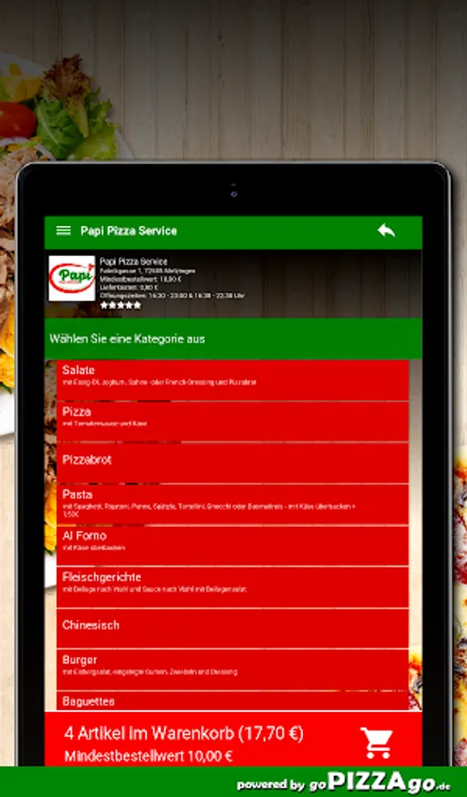 You can easily order tempting meals from us here. Of course, you can expect a tasty range of 159 dishes and drinks. Customers are happy to order these dishes. Our delivery times are
