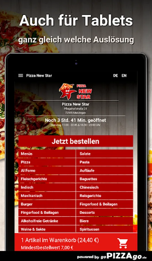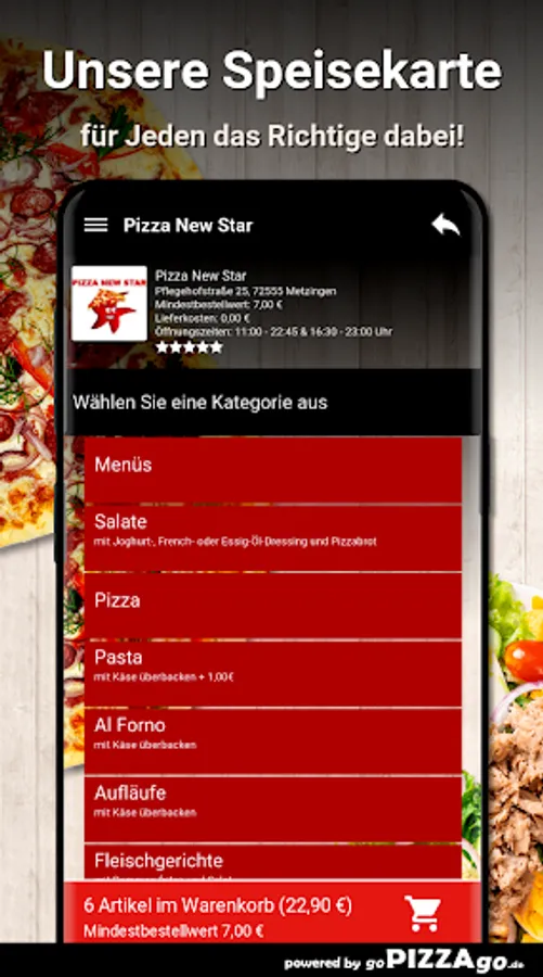 You can order many freshly prepared dishes in our shop with our pizza home service quickly and safely online. Choose from a varied range of 188 delicious dishes such as mixed salad, 1 large enchilladas, gyro plate and also chicken casserole for 8.00 euros. We are happy to order these