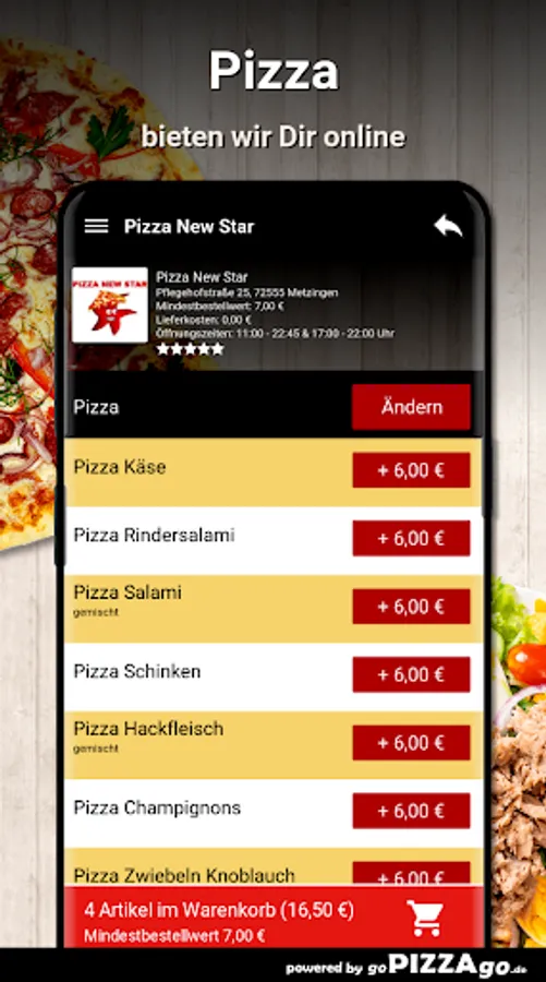 Pizza New Star online offers you six tasty schnitzel dishes. Cordon Bleu for an incredible 8.50 € to any delivery address of your choice, Schnitzel Hawaii can be ordered and delivered for 8.50 euros, baguette turkey schnitzel directly to you. Breaded schnitzel, hunter schnitzel, gypsy schnitzel. Let Pizza New Star spoil you with culinary delights!