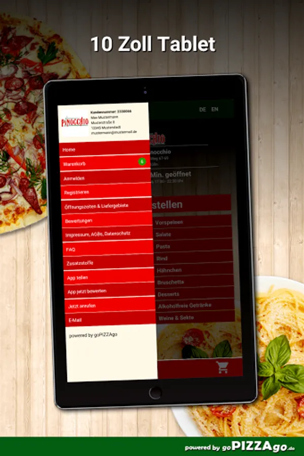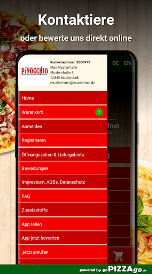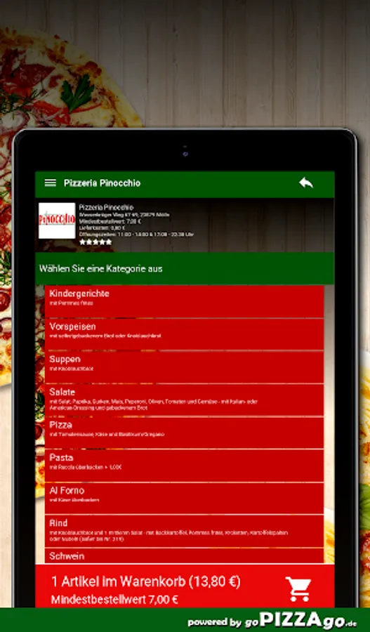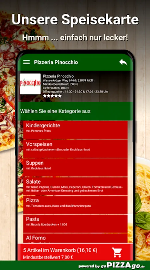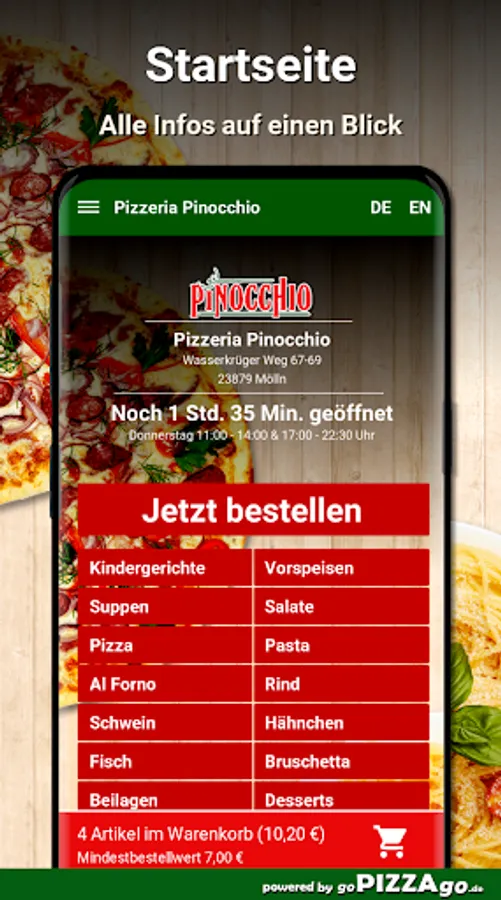 Of course, you can easily order food or drinks from our pizza service in our shop online. Choose from more than 129 fresh dishes (Pizza Frutti di Mare, Tagliatelle con Carne, Salmone con Spinaci, Spaghetti con Scampi e Rucola, Baked Potato al Forno, Spaghetti Frutti di Mare or Spaghetti Bolognese for 6.70 euros). We also have tasty treats for boys & girls such as fish fingers for € 6.00, chicken nuggets for € 6.90.Pizzeria Pinocchio Top-7We deliver at the following times