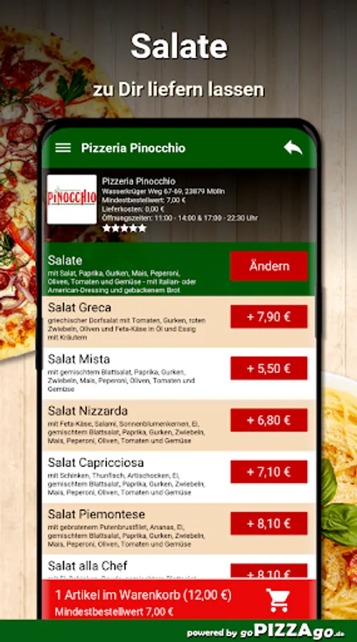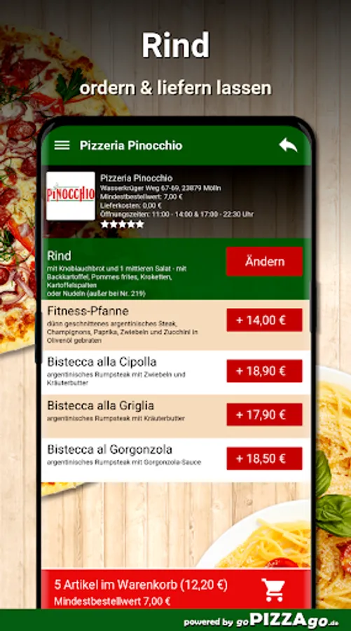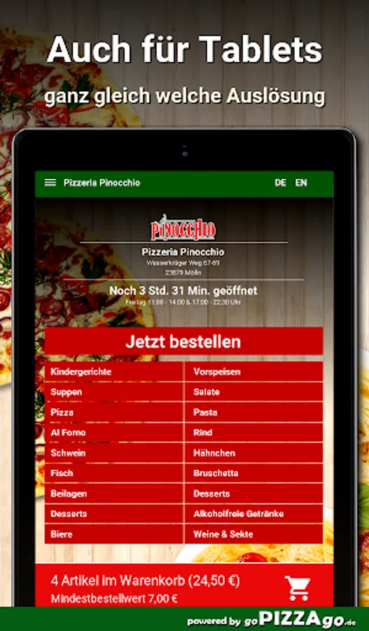 Welcome to Pizzeria Pinocchio in Mölln Do you fancy starters, beef, chicken, pasta, pizza to order online and have it delivered?