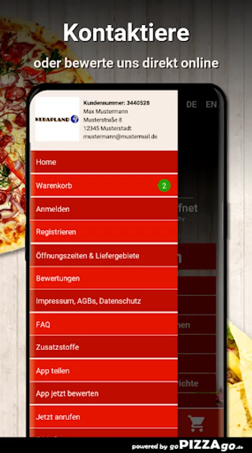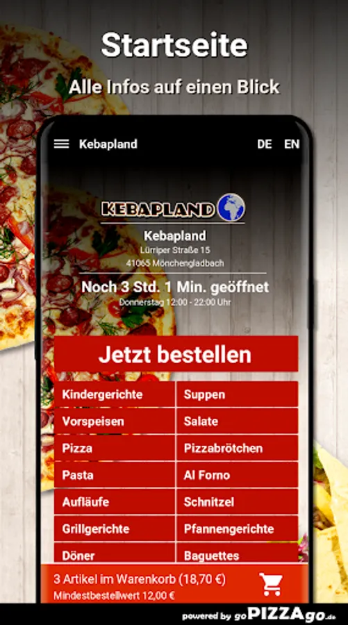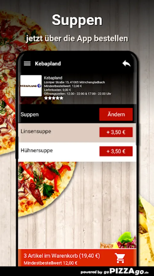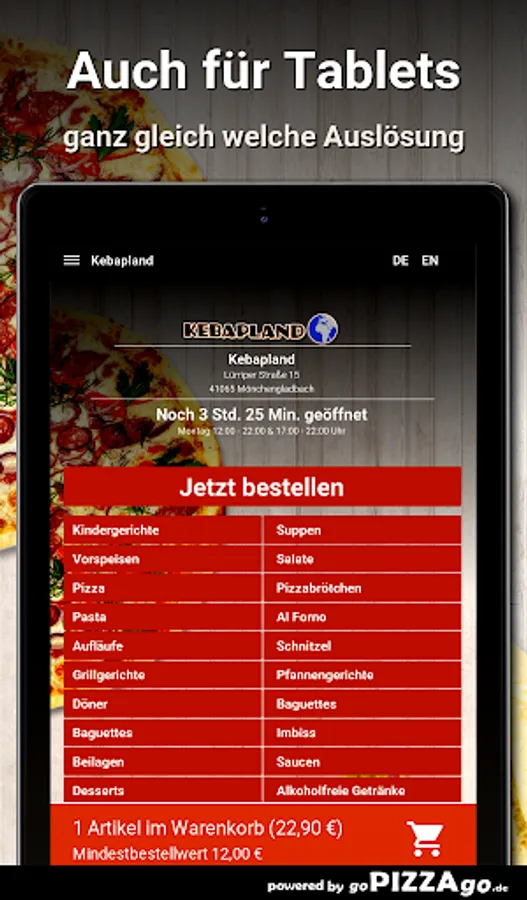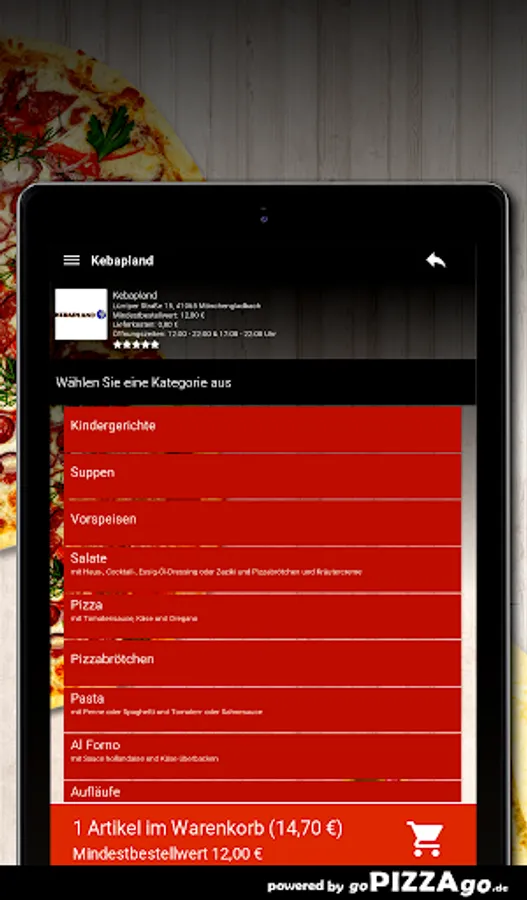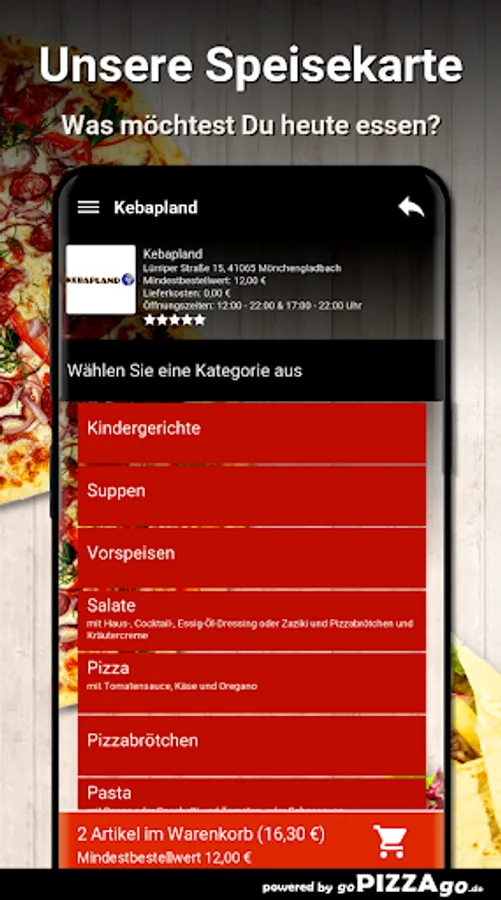 You can easily order tempting meals from our Kebapland pizza service and have them delivered quickly. We have 154 dishes for you, including rotisserie with chicken XXL, 6 pizza rolls, 2 lamb skewers, baguette tuna, salad di Pomodori, salad Kebapland, Dürüm rotisserie from chicken XXL. For boys and girls we have a children's menu - chicken rotisserie for 4.90 euros, children's menu - Köfte for 4.90 euros, children's menu - chicken wings for 3.90 euros, children's menu - veal rotisserie for 4.90 euros, children's menu - Chicken nuggets for € 3.90. This is what we order most of our delivery times
