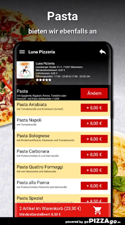 You can order many fresh dishes in our online shop from our Luna Pizzeria delivery service and have them delivered to your office or home. Of course, you can expect a tasty range of 285 fresh dishes. For dessert we recommend spaghetti ice cream, tiramisu, orange ice cream, ice cream with half a coconut.Our top 7 itemsOur delivery times are