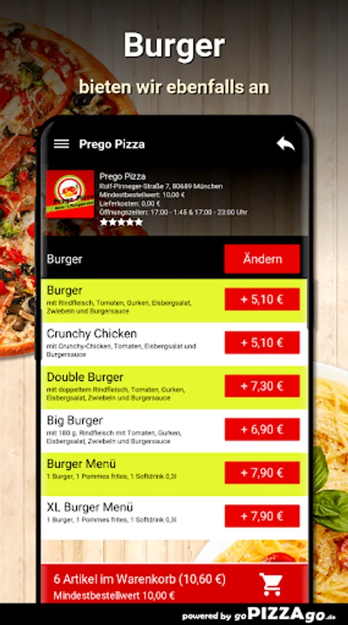 Seafood pizza, excellent vegetarian pizza, can be ordered for 6.90-16.50 euros. Pasta Napoli, Pizza Oriente with sucuk, peppers and onions are available for 6.90-16.50 euros, Pizza Gorgonzola is available from Prego Pizza for only 6.50-15.50 €.