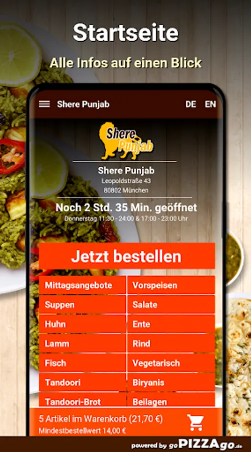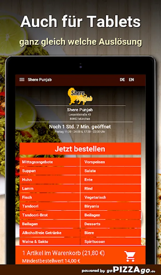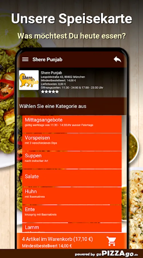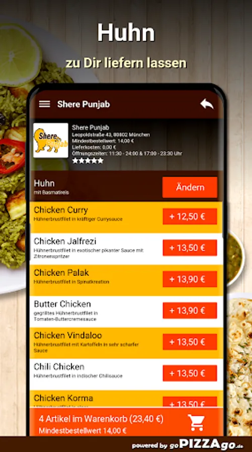 You can easily order many freshly prepared specialties from the delivery service Shere Punjab (80802 Munich) here. A selection of 145 dishes awaits you, including garlic naan, jheenga masala, bharta, lamb palak or perhaps fish tikka for 13.90 euros. Also order drinks, we have apple juice, Fanta, Sprite. Or of course the lunch menus such as Chicken Jalfrezi, Fish Curry, Lamb Vindaloo. Customers like to order these dishes We deliver at these times