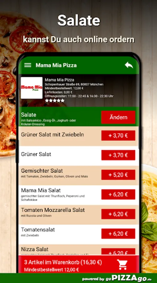 Salad tour for the health-conscious in Munich? Mama Mia Pizza makes it possible! A very good range of thirteen salads are offered to you for delivery. The delivery service brings you tomato mozzarella salad, farmer's salad at a price of € 6.20, crispy chef's salad € 5.50 and tomato salad with onions is available online for just € 5.40. Your Mama Mia Pizza Team in Munich