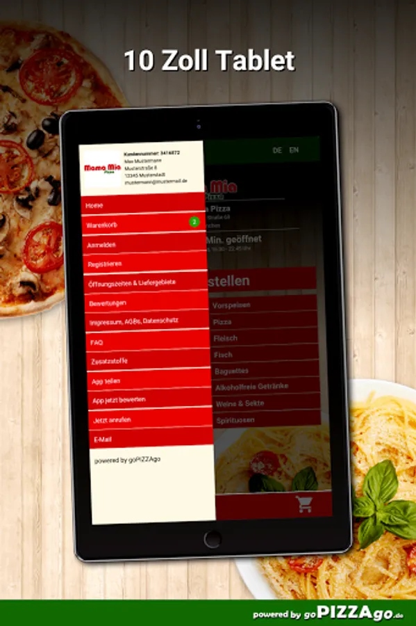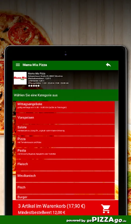 You can order and pay for a great selection of aromatic food online from our Mama Mia Pizza delivery service. Choose from a range of 121 freshly prepared dishes such as Mama Mia salad for 6.20 euros or chef's salad for 5.50 euros. The delicious offers for lunch break: Menu 6, Menu 4, Menu 2, Menu 1, Menu 5, Menu 3. For dessert we offer: Ben & Jerry's, Tiramisu, Greek yoghurt. We also deliver soft drinks to you. We have Mezzo Mix 1.0l, Coca-Cola light 1.0l, mineral water 1.0l, apple juice 0.7l, Fanta 1.0l in our offer