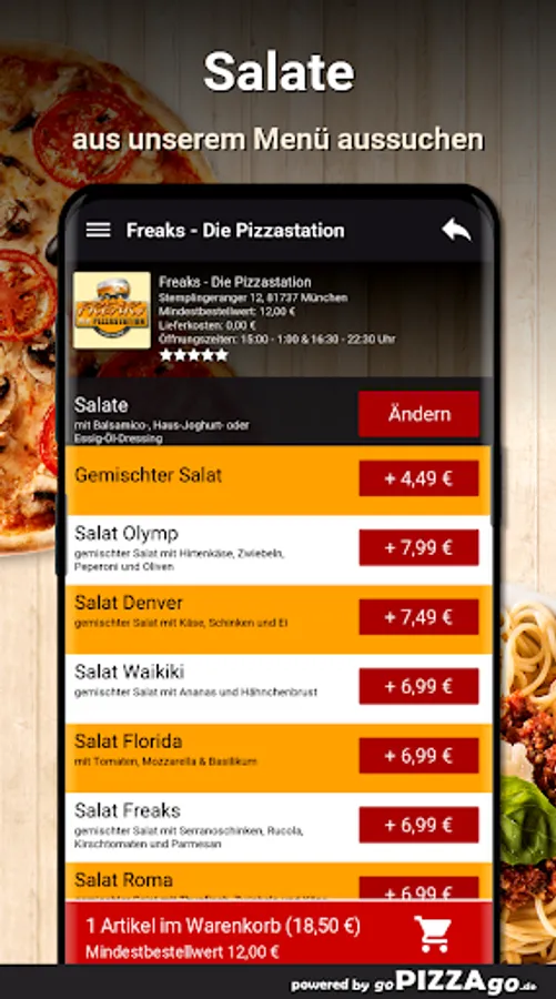 Do you like it healthy? Refreshing salads at Freaks delivery service - the pizza station .. simply fine! The salad dishes at Freaks - the pizza station are a healthy experience. We offer you 7 salads. Freshly prepared salad Olymp with balsamic, house yoghurt or vinegar-oil dressing is delivered to your home or office at a price of 7.99 euros. Fresh and young mixed salad, salad freaks with balsamic, house yoghurt or vinegar-oil dressing € 8.49. Crisp, fresh Waikiki salad is available for € 6.99, you can get a crisp Denver salad at Freaks- The pizza station for € 7.49, Roma salad and Florida salad are available from the delivery service for € 6.99.