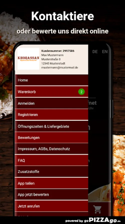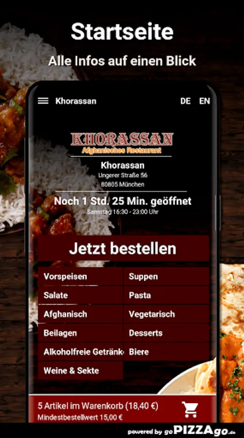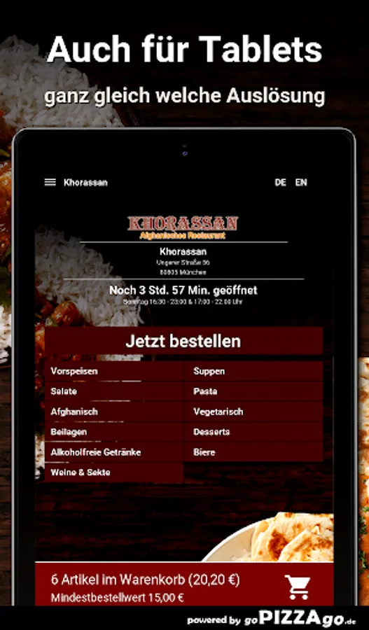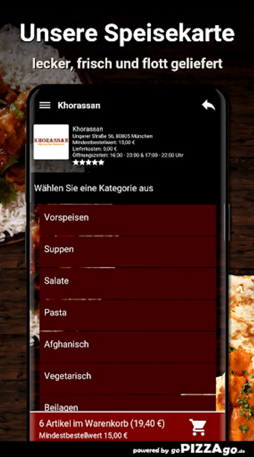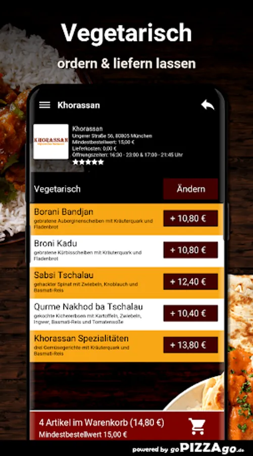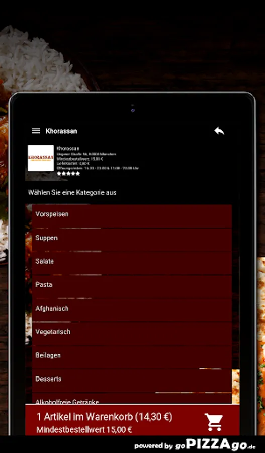 You can order hearty feasts from the Khorassan delivery service (80805 Munich) here. The menu has a choice of 82 meals, Borani Bandjan, Narendj Palau, Tschalau, cheese salad, Aschak, spinach.What do people like to order? Our delivery times
