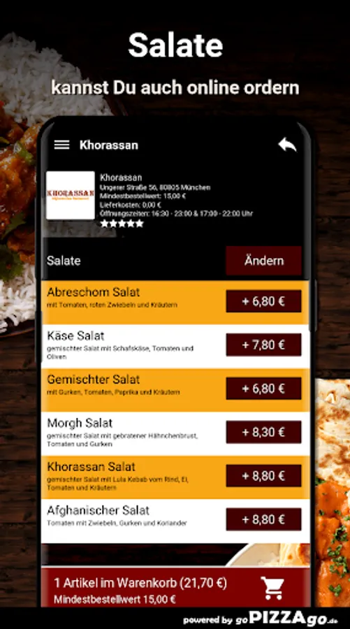 Have tempting salads delivered in Munich by delivery service KhorassanOur six fresh salads are a delicious and healthy mixture against your hunger. You can get Khorassan Salad at Khorassan for 8.80 €, absolutely delicious Morgh Salad for a staggering 8.30 €, crisp, fresh Abreschom Salad is delivered for a price of 6.80 €, crispy Afghan Salad is available here online for only 4, € 30 for delivery, mixed salad to your home or office and you can get a young and crunchy cheese salad at Khorassan for € 7.80.
