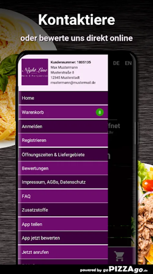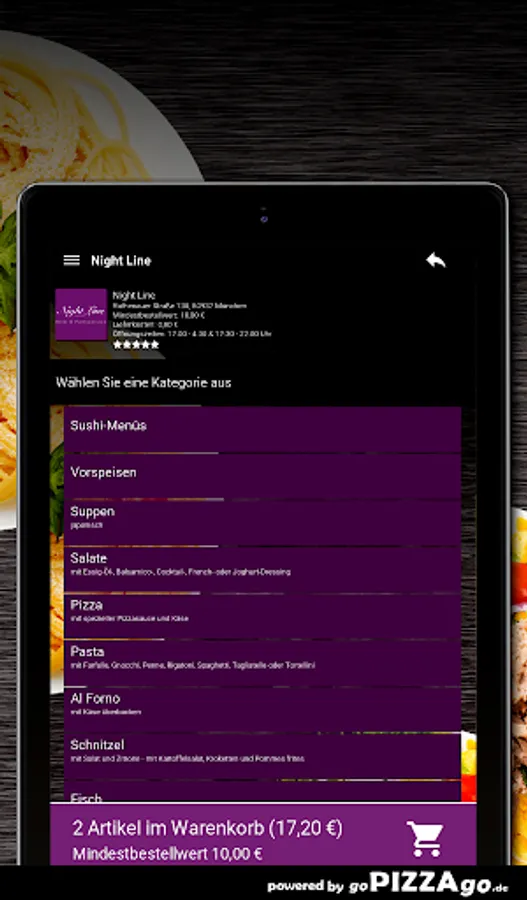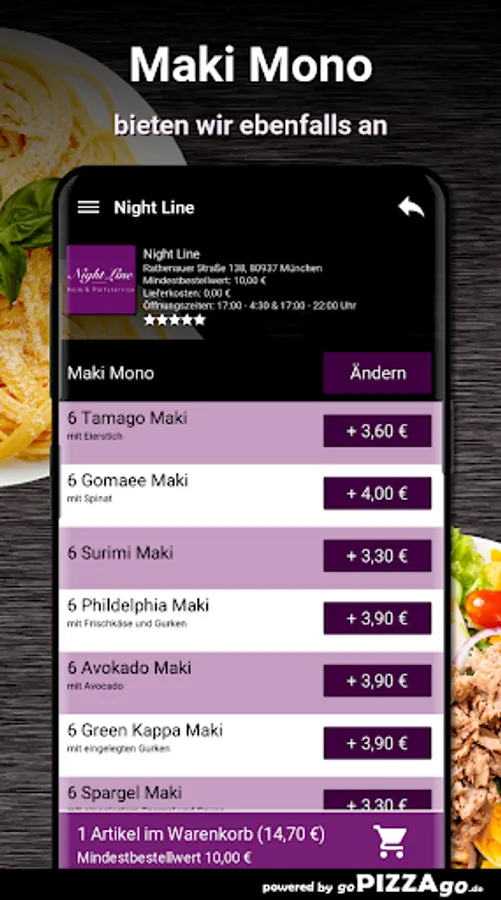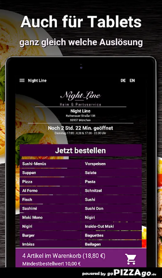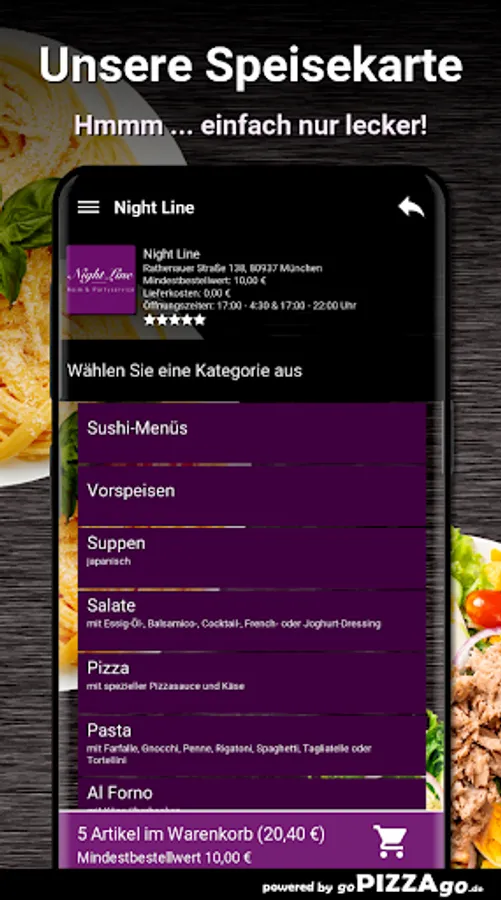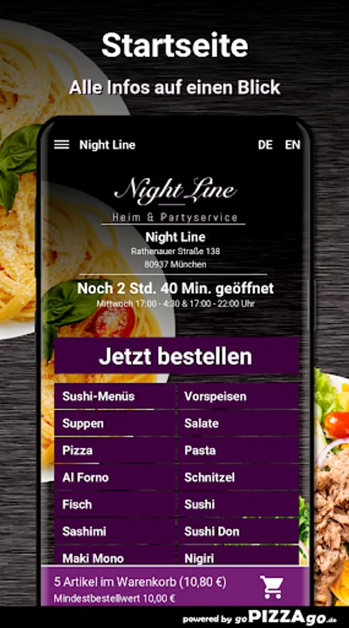Order food online at Night Line Are you hungry for pizza, starters, nigiri, snacks, sushi don, burgers, pasta to order online?