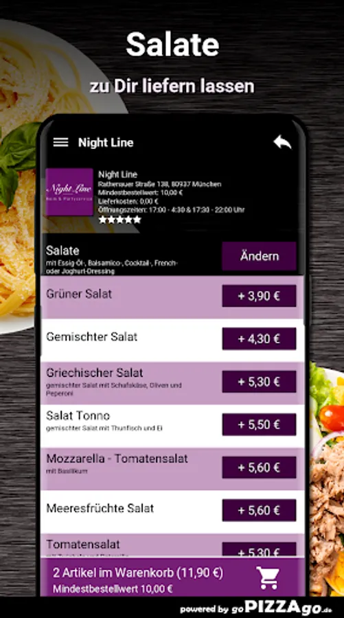 Slightly appetizing: Have wonderful salads freshly delivered online by Night Line in Munich! You can also conveniently order crunchy salad dishes (14 in total) from us and have them delivered as quickly as possible. Japanese uminosachi salad is brought to you for € 9, green salad, mozzarella - tomato salad with basil is available for € 5.60, crisp tomato salad is delivered for € 5.30, the best Americana salad is available here online for only Have 5.92 euros delivered, Night Line has absolutely delicious potato salad for just 4 € or you can get Salad Tonno at Night Line for 5.50 €. Night Line wishes you bon appetite