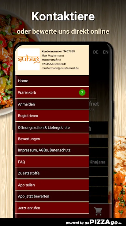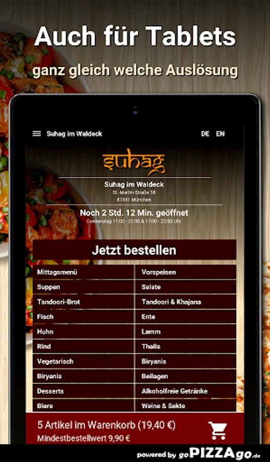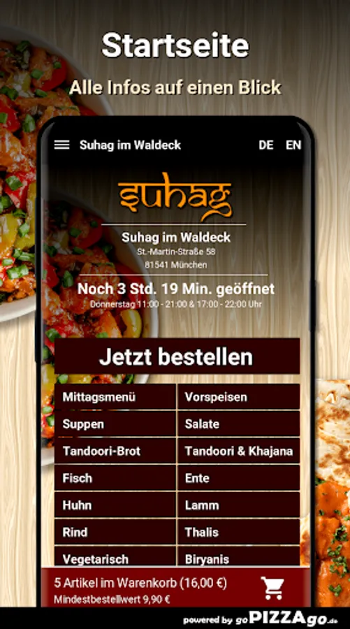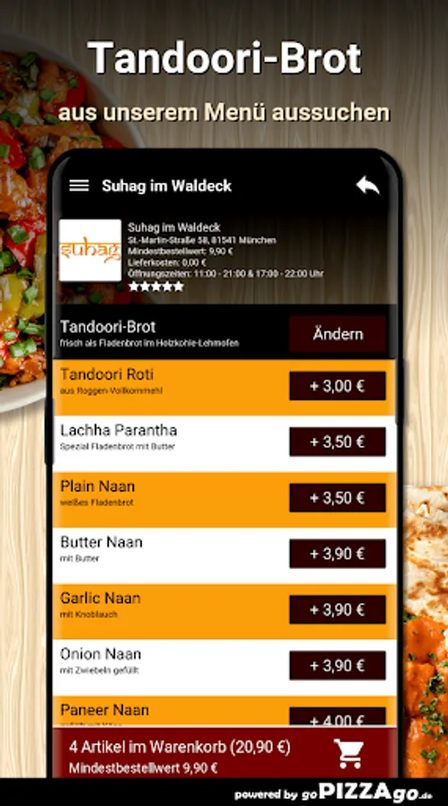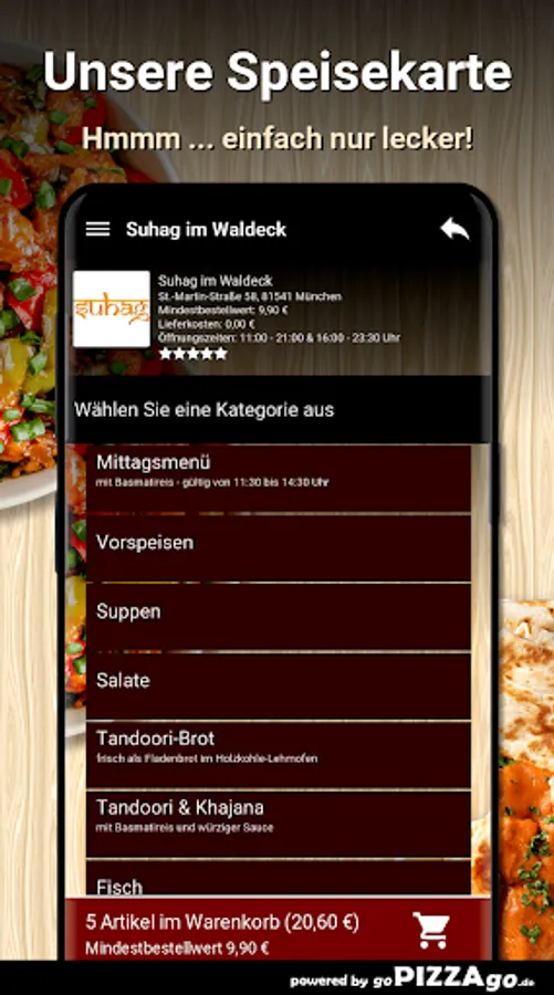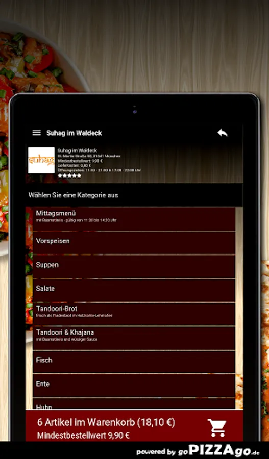 Food, freshly prepared and delivered hot, can be easily ordered online from our Suhag delivery service in the Waldeck in Munich. Choose from 205 dishes and drinks from our menu (Butter Naan, Fish Pakoras, Channa Masala, Lamb Jalfrezi or Jheenga Masala for 22.00 EUR). Our offers for your lunch break: Duck Sabzi Mango, Paneer Masala, Fish Sabzi, Mango Vegetable Curry, Lamm Jalfrezi, Fish Tikka The hits at Suhag in WaldeckWhen we deliver your food