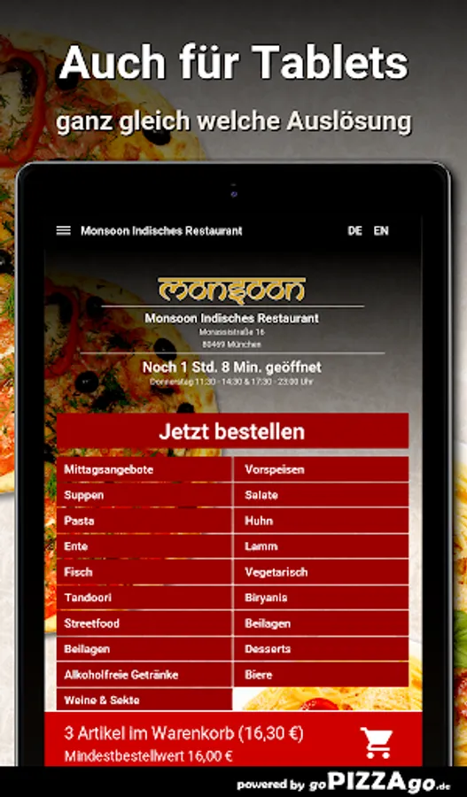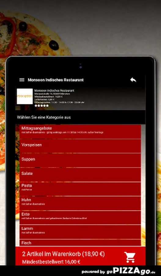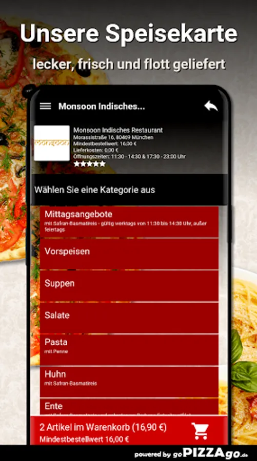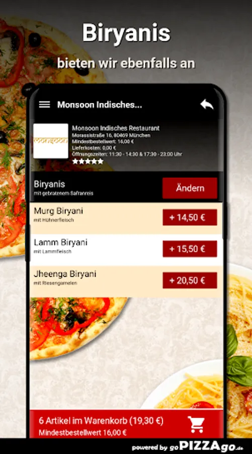 Craving for Indian? .. of course no problem at Monsoon Indian Restaurant in MunichDelicious Indian delicacies can be ordered here and delivered quickly. Tasty Vegetable Pakora is available online here for only €5.50 as delivery to the location of your choice, Pasta Masala to almost any place of stay, aromatic Rogan Josh has Monsoon Indian Restaurant for only €14.90. Prawn Masala can be ordered online for €20.90, Palak Gosht, 2 Vegetable Samosas are available for €5.90, Malai Kofta and Chicken Mango with saffron basmati rice.