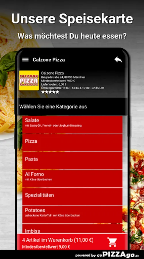 Order salads, potatoes, snacks online at Calzone Pizza Would you like to order salads, pizza, Al Forno, snacks, pasta, potatoes online?