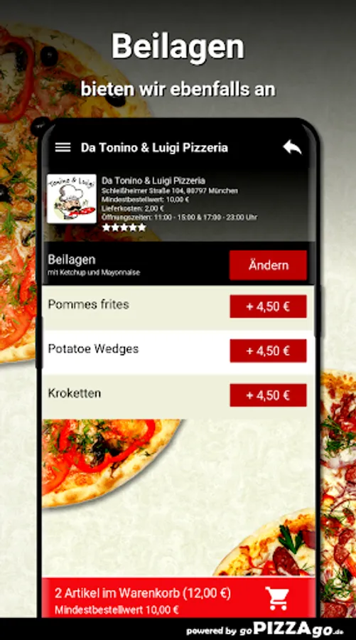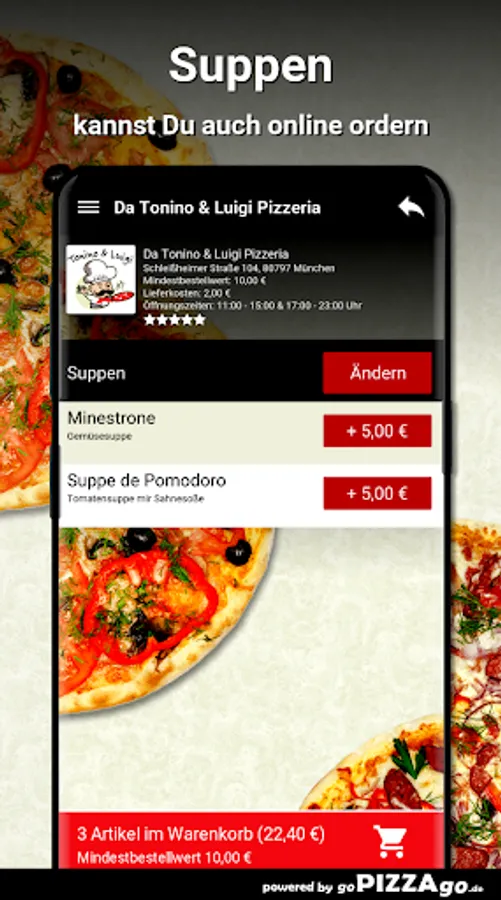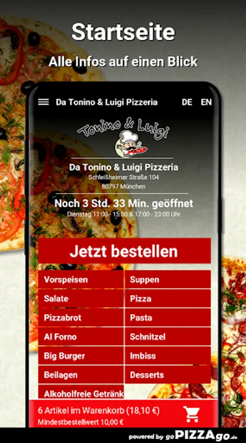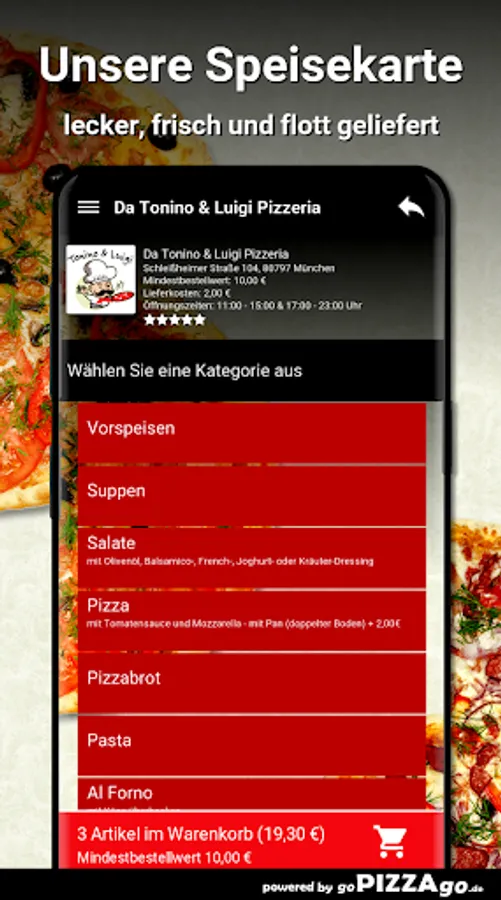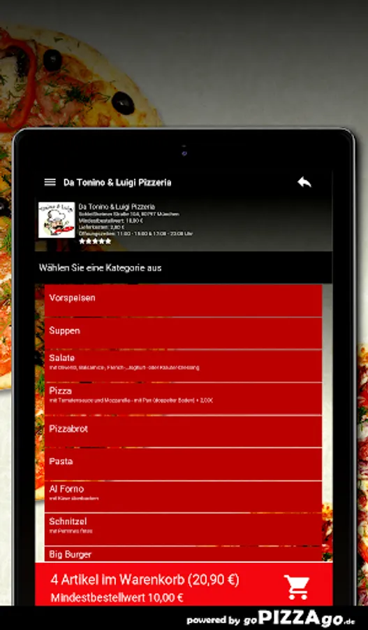 Da Tonino & Luigi Pizzeria - order delicious, enjoyable dishes online. With us you can order pizza bread, al forno, snacks, pasta, schnitzel, soups, salads, appetizers and have them delivered.