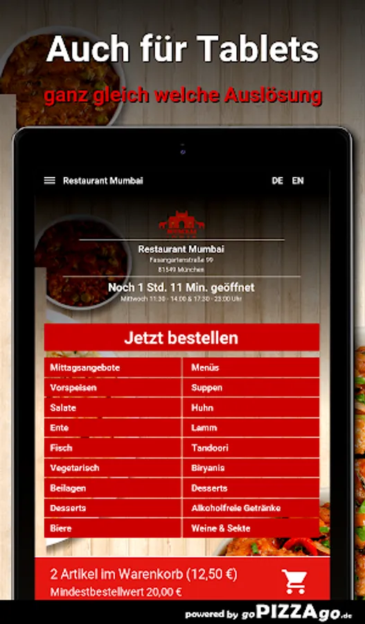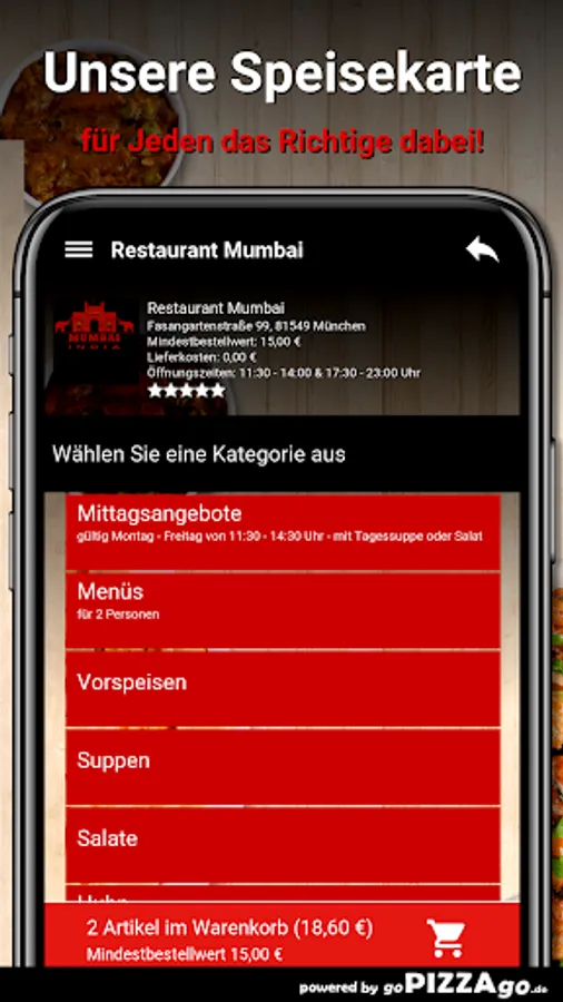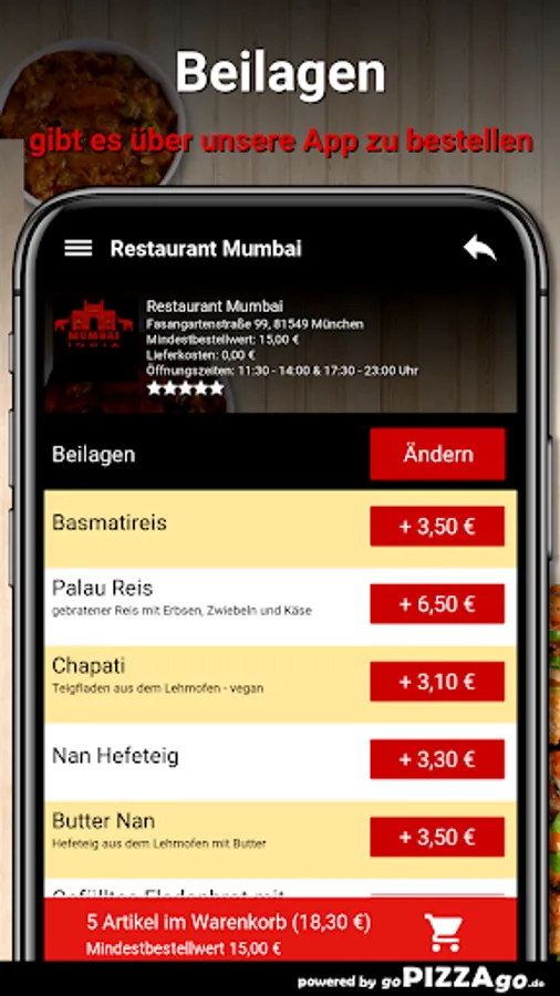 Of course, you can order freshly prepared duck, lamb, tandoori, biryani, chicken, vegetarian dishes... from us. You can easily order truly flavorful meals from our delivery service, Restaurant Mumbai, and have them delivered immediately. A truly delicious selection of over 191 delicious dishes awaits you (Chicken Jafrani, Garhwal Shabsie, Duck Vindalu, Karahi Ghost, Chicken Bhunna, Duck Shabsie, or Lamb Masala for €17.50). For lunch, you can also have Chicken Shabshie, Chapati, Lamb Curry, Fish Badami, Shabshie, and Chicken Tikka delivered from Restaurant Mumbai in Munich. Our popular top sellers: When does Restaurant Mumbai deliver?