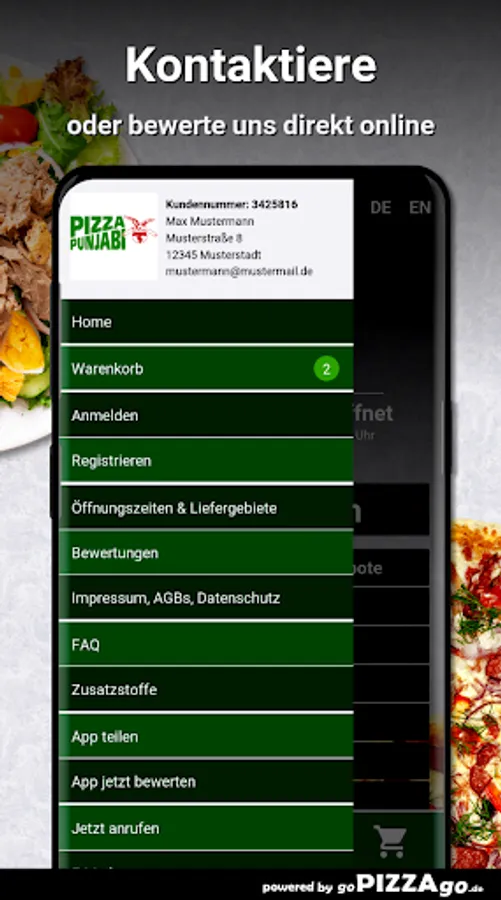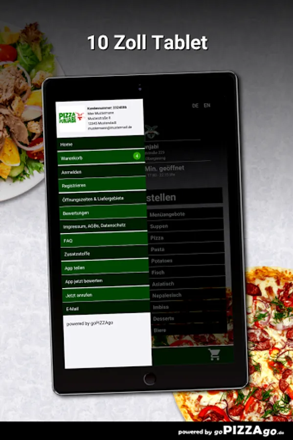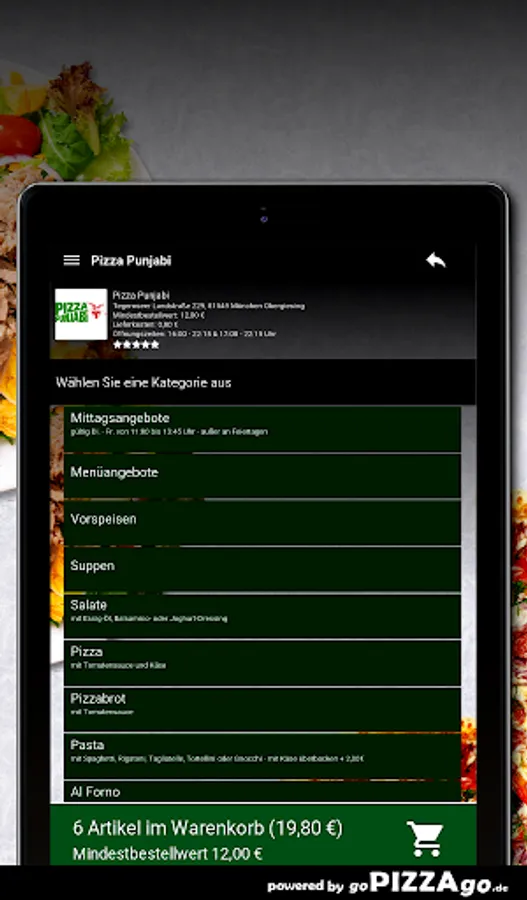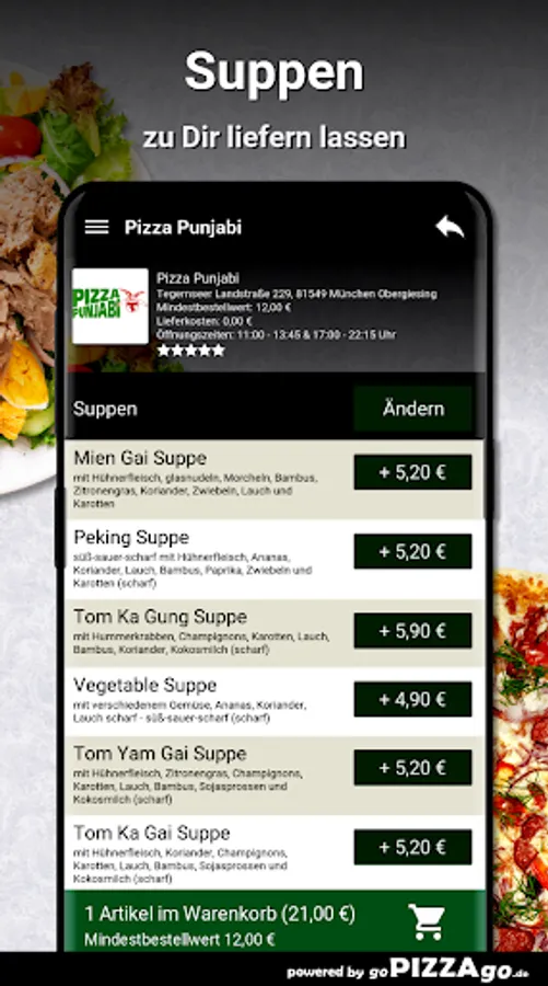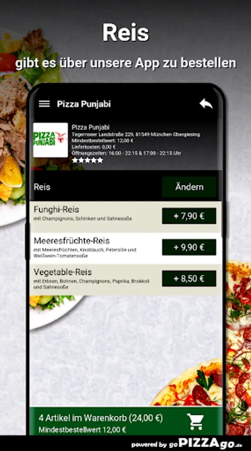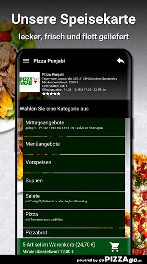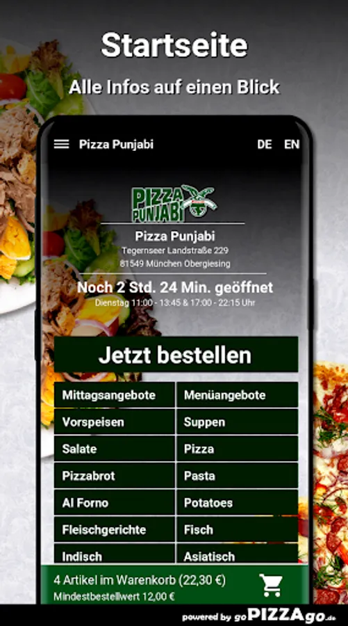 You can easily order tempting meals from our Pizza Punjabi delivery service here. You will find 336 delicious dishes in our menu, including Sabastes Pizzaiola, Nan, Lamb Punjabi, Lamb Palak. You can also order thirst quenchers, we have a fruit mix, Spezi original, Adelholzener soft mineral water, apple juice, sweet lassi, tangerine lemonade. Of course we also have lunch such as 1 pasta dish, 1 pizza 26cm at really low prices. We are happy to order these from us. You can order food at these times