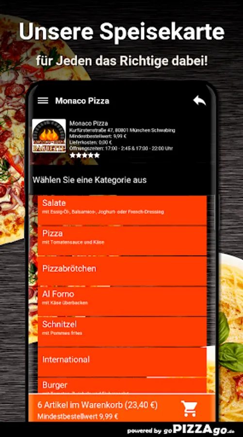 Whether pasta, pizza or meat ... enjoy eating at Monaco Pizza today like at Mum's in Italy! We also have 43 Italian delicacies on offer conveniently online with our delivery service. Excellent pizza vegetarian, Tortellini Quattro Formaggi al Forno, Pizza Sucuk, Pizza Salami can be delivered to Monaco Pizza for only € 9.90-17.90. Pizza Parma for a fabulous € 13.30-25.90, the delivery service brings you spaghetti al forno at a price of € 8.50, rigatoni sucuk al forno, pizza rocket for delivery, pizza funghi or delicious pizza americana 11.90 -21.90 euros.