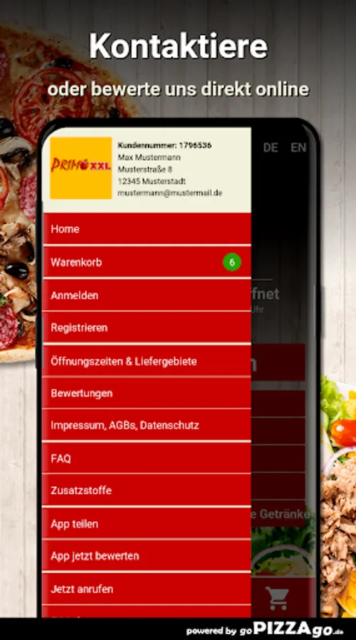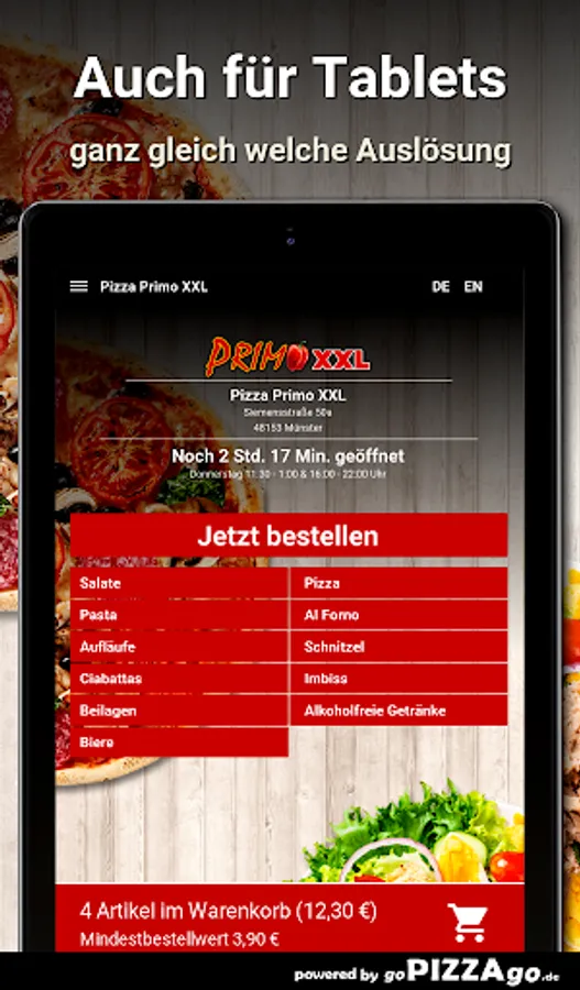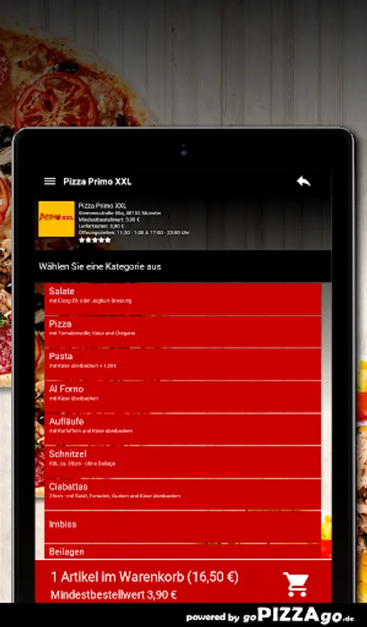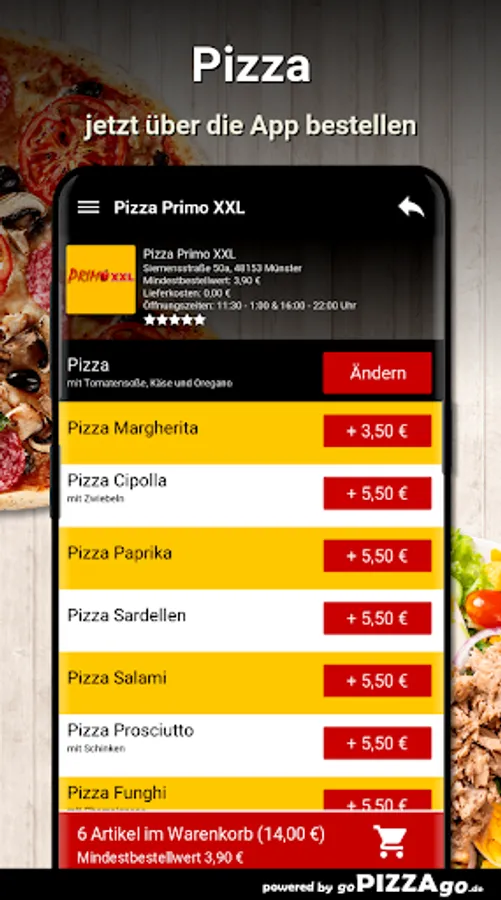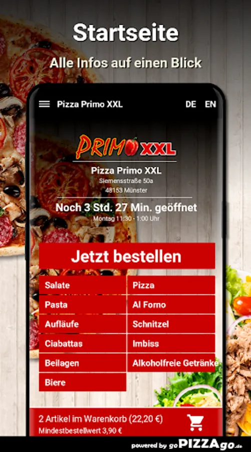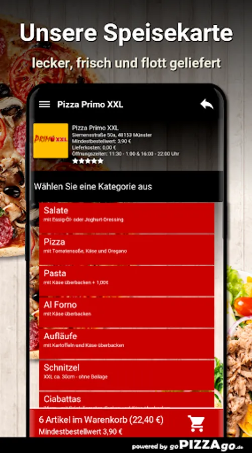 You can order and pay for fresh food online from us. Choose from a varied range of 104 delicious dishes such as salad primo, gypsy sauce, ciabatta ham, pizza Dolomiti or pizza Jimmy for 6.00 EUR. Also order drinks such as Coca-Cola, Sprite, Vitamalz, Fanta. Customers find that the bestThe delivery times of Pizza Primo XXL