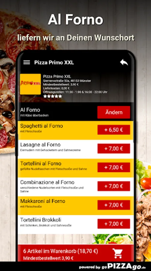 A piece of Italy around the corner from Pizza Primo XXL in Münster 8 pasta creations are available online from Pizza Primo XXL. Tortellini alla Mamma is brought to you for € 7.00, Spaghetti Panna Funghi is delivered to your home for € 6.50, Spaghetti Tonno (€ 7.00), Tortellini Parma is delivered to you for € 7.