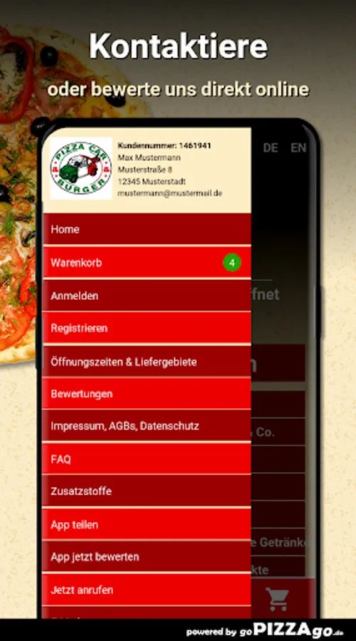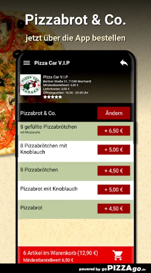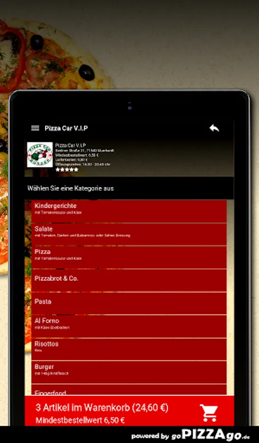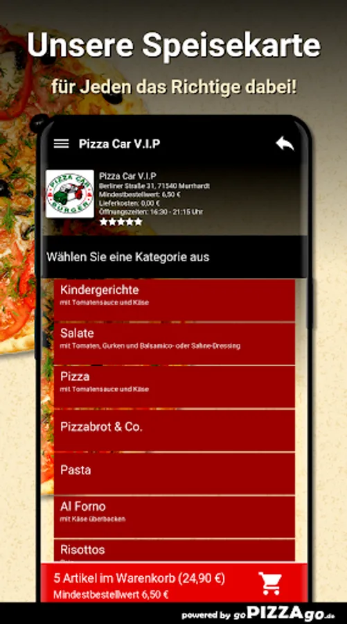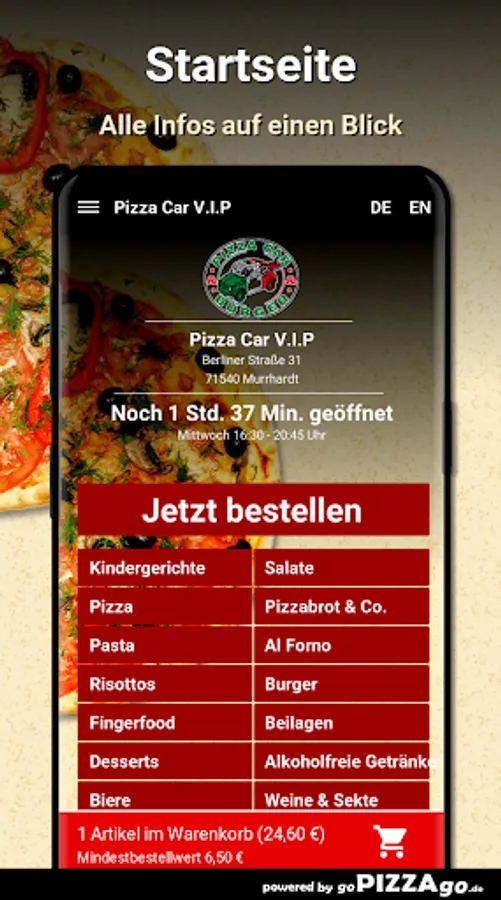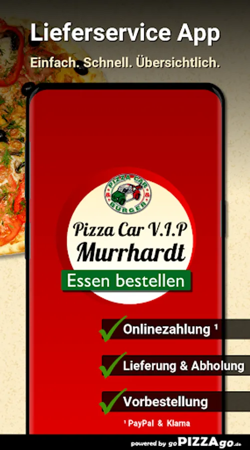 You can order tasty and fresh food quickly and easily from the Pizza Car VIP delivery service (71540 Murrhardt) and have it delivered. In our online menu you will find 101 freshly prepared dishes such as Italy Burger, Insalata Caesar, Pizza Rustica, Pizza Sicilia, Pizza Cheeseburger and Pizza Mia for 23.50 euros. You can order the popular dishes at these times