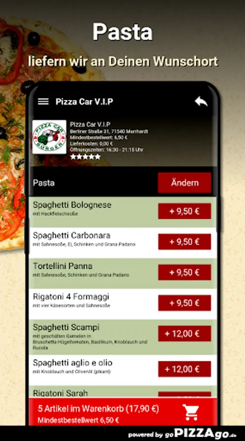 Enjoy with friends the absolutely tasty pastas from Pizza Car V.I.P MurrhardtPizza Car V.I.P has seven hot & fresh pastas in its clear menu. Tortellini panna. The delivery service brings you delicious spaghetti scampi for a price of €12.00, you can get deliciously prepared spaghetti aglio e olio with garlic and olive oil (spicy) for €9.50, Rigatoni 4 Formaggi.