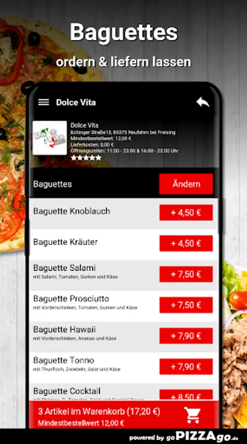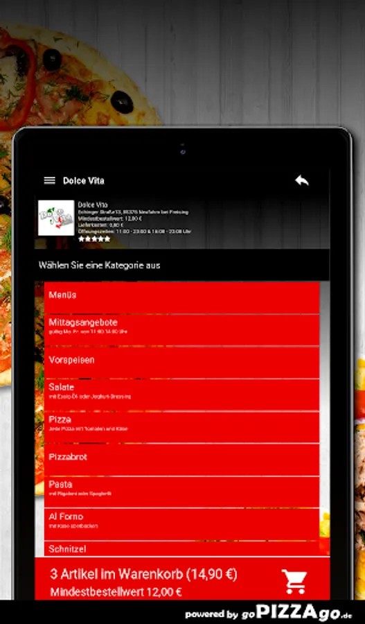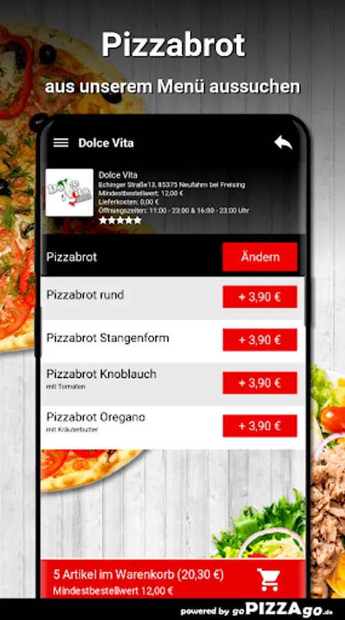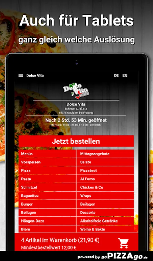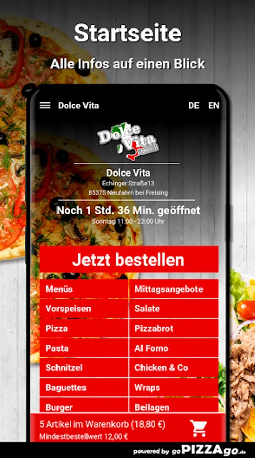 Of course, you can safely order a wide variety of dishes from our Dolce Vita delivery service in Neufahrn near Freising in our shop. More than 169 delicacies, Insalata Mozzarella, Pizza Funghi Salami, Tortellini alla Panna, Insalata Capricciosa. Absolutely no desire to cook for yourself at lunchtime? Then order the double burger menu, burger menu, maxi menu, jumbo menu, big burger menu, family menu. Dessert? Our offer includes delicious mouse au chocolat, Häagen Dasz ice cream, mango cream, tiramisu. The seven most delicious dishesWhen does Dolce Vita deliver?
