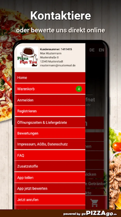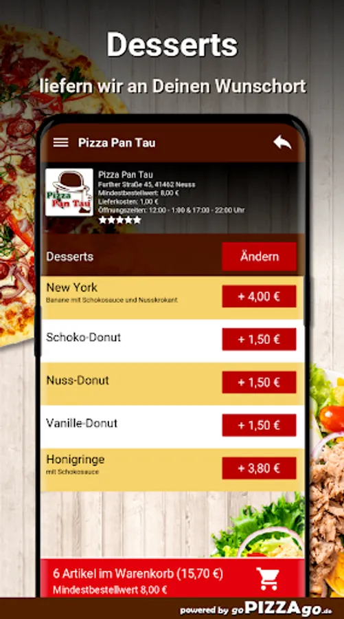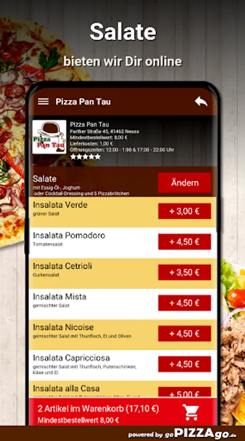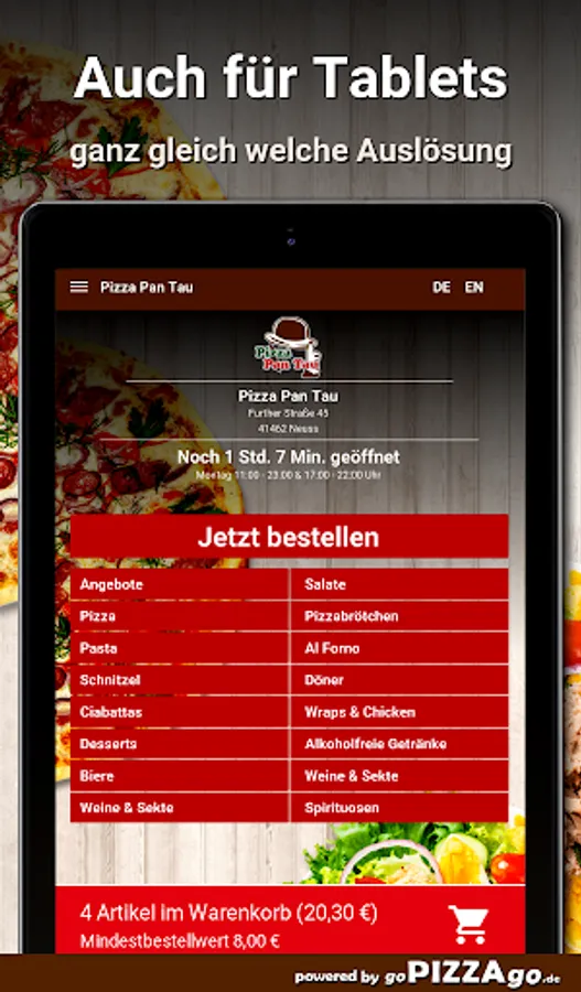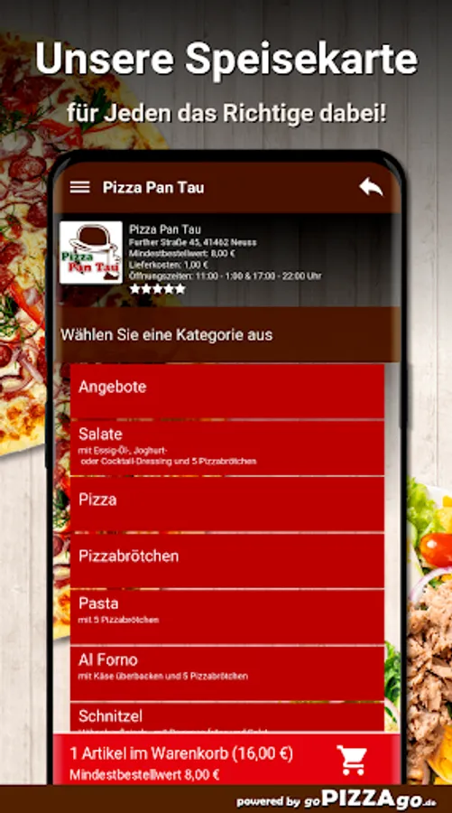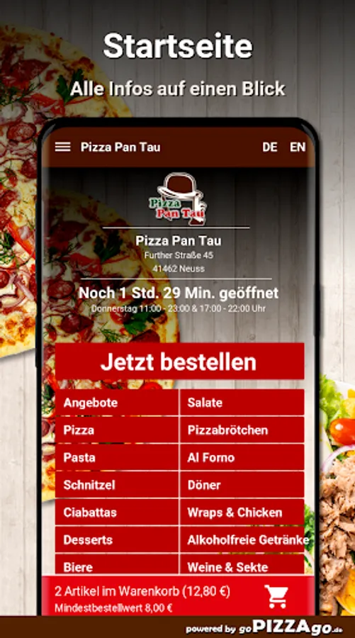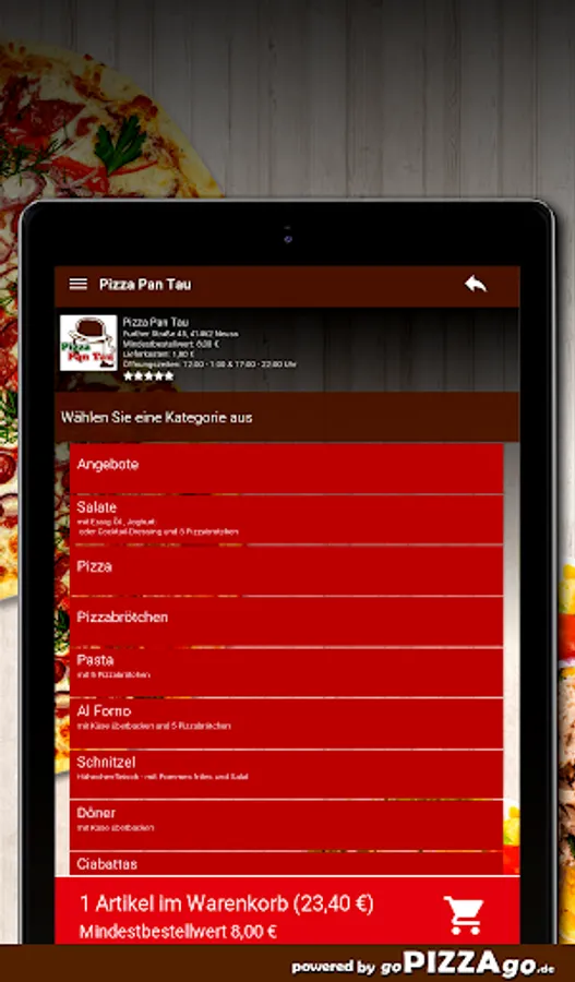You can order and pay for a number of tasty dishes online from the Pizza Pan Tau delivery service (41462 Neuss). Choose from 149 dishes, a selection of delicacies: Ciabatta Vegetaria, Pizza Bolognese, Spaghetti al Tonno, Pizza Valentino. You can also order soft drinks such as water, mezzo mix, Sprite, Coca-Cola. Customers will find the following specialties bestOur opening times