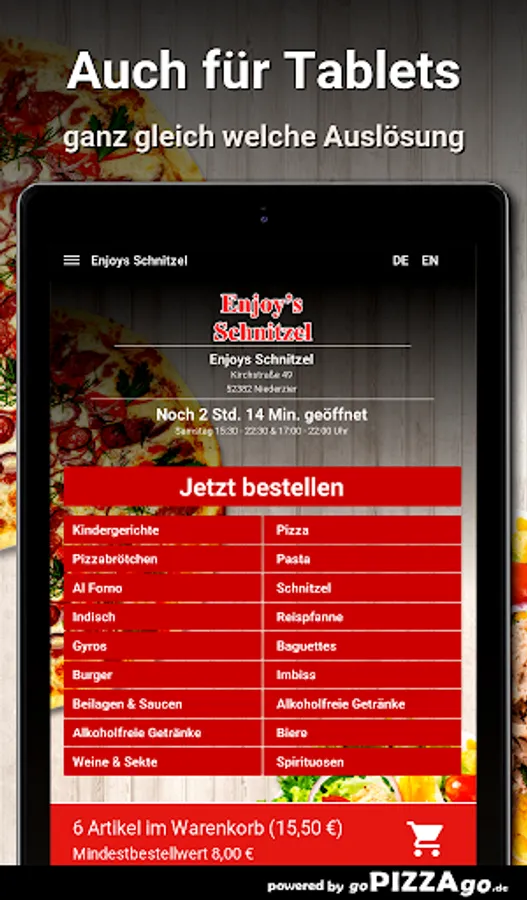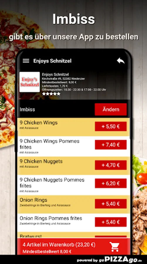 Nothing easier than this: order pizzas in Enjoys Schnitzel Niederzier .. Of course we also have pizzas in many different flavors. Pizza Arizona (€ 9.50-16.30). Pizza Funghi is available online for only 7.50-11.30 €, you can get original Pizza Napoli with tomato sauce and cheese for 8.50-13.30 euros, Pizza Athens is available online for only 9.50- 16.30 €, Pizza Vegetaria is available online for only 8.50-14.30 € or Pizza Bombay Chicken.