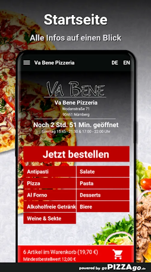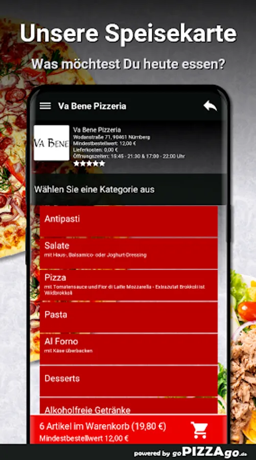 Are you hungry and in the mood for pizza at Va Bene Pizzeria in Nuremberg? Have you ever ordered really fresh pizzas from Va Bene Pizzeria & had them brought to you? Pizza Diavolo is available for 9.90 €, crispy baked and topped Pizza Salsiccia e Friarielli can be delivered to your home for 10.50 €, Pizza Salami to order online, Pizza Prosciutto can be delivered to the desired location for 8.50 € Choice, Va Bene Pizzeria has pizza Funghi for only 8.50 €, Pizza Speciale, Pizza Parma, crispy baked and topped pizza Hawaii is delivered to you for 9 €, Va Bene Pizzeria has pizza Prociutto e Funghi for only 9, 00 euros, crispy baked and topped Pizza Del Sud.