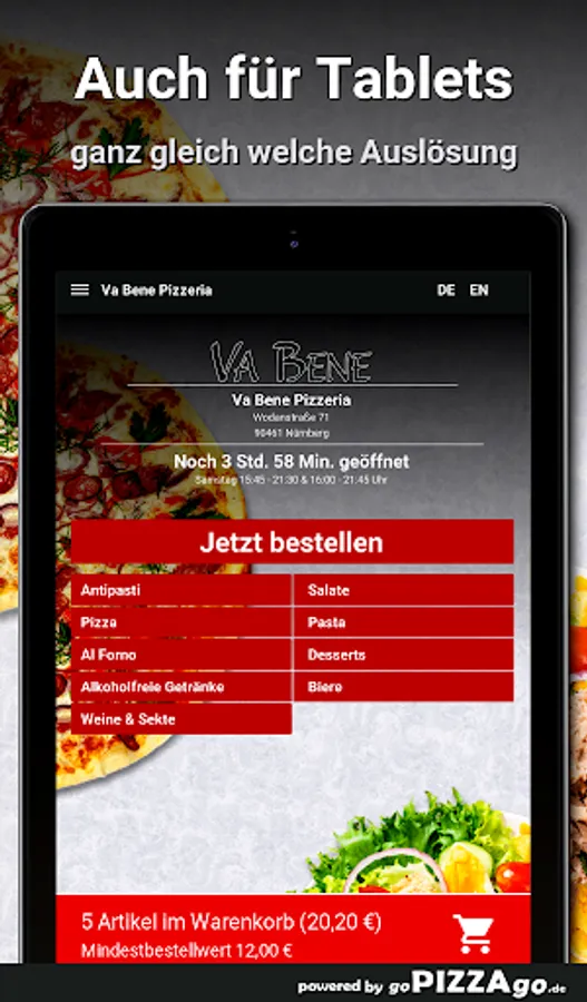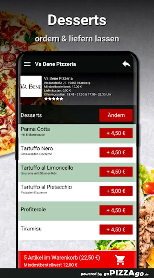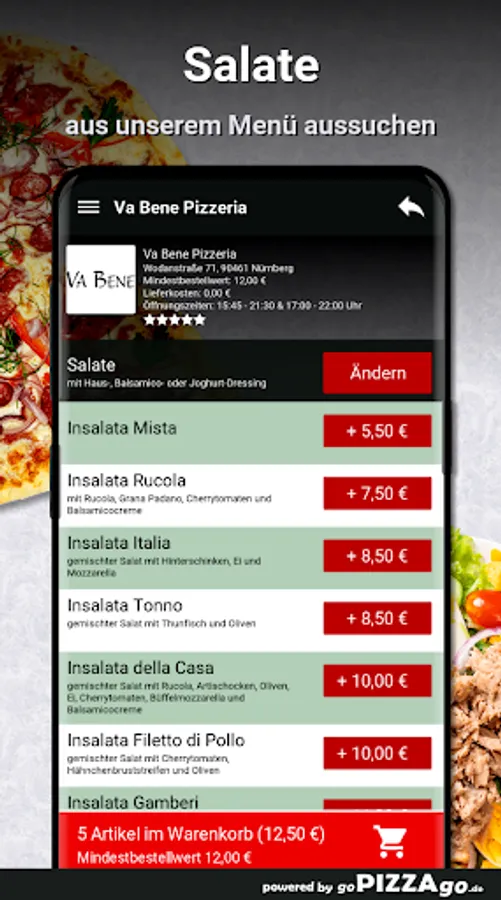 You can order a large selection of freshly prepared specialties from Heimservice Va Bene Pizzeria (90461 Nuremberg) easy online. A variety of 73 dishes such as Pizza Parma, Penne Verdure, Panini or Pizza Kapadokkien for 9.50 euros.Va Bene Pizzeria Top-7When do we deliver?