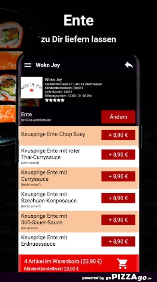 Asian dishes at Wokn Joy Oberhausen In the menu of our delivery service you will of course find Asian offers with delicious dishes from the Far East. Aromatic tasting Baked fish fillet Chop Suey is brought to you for 9.60 euros. Bami Goreng can be delivered quickly at Wokn Joy for € 7.00, Baked Chicken Thai Curry can be ordered for € 7.50, Nasi Goreng is available for € 7, and Chinese spring rolls are available for € 3. Tom Kha Gai soup and vegetarian chop suey are available online here for just 6.50 euros.