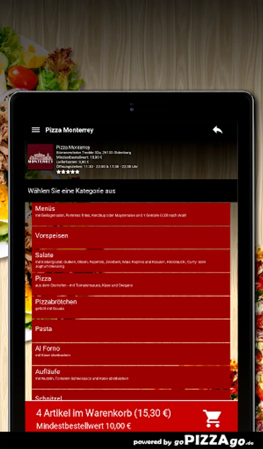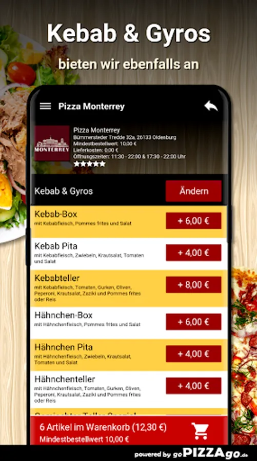 You can order freshly prepared dishes from the Pizza Monterrey delivery service (Bümmersteder Tredde 32a in Oldenburg) and have them delivered to your home or perhaps your office. The menu in the online shop offers you more than 187 dishes and drinks such as baguette special for EUR 7.50 or 10 squid rings for EUR 5.00. You can also order non-alcoholic beverages: Sprite, Uludag, Ayran. We are very happy to order these When do we deliver?