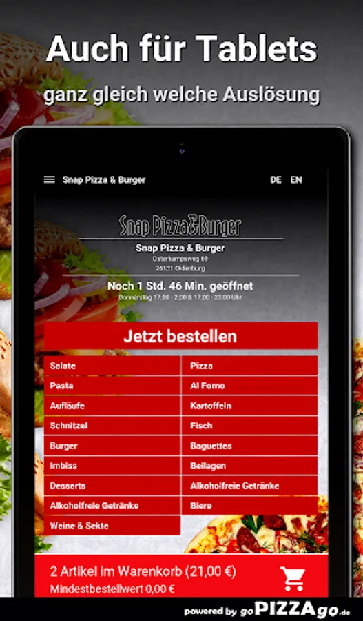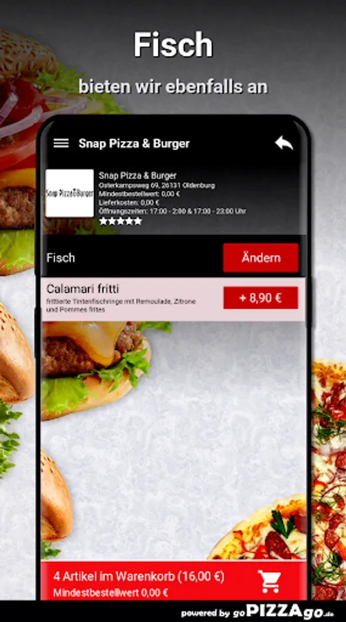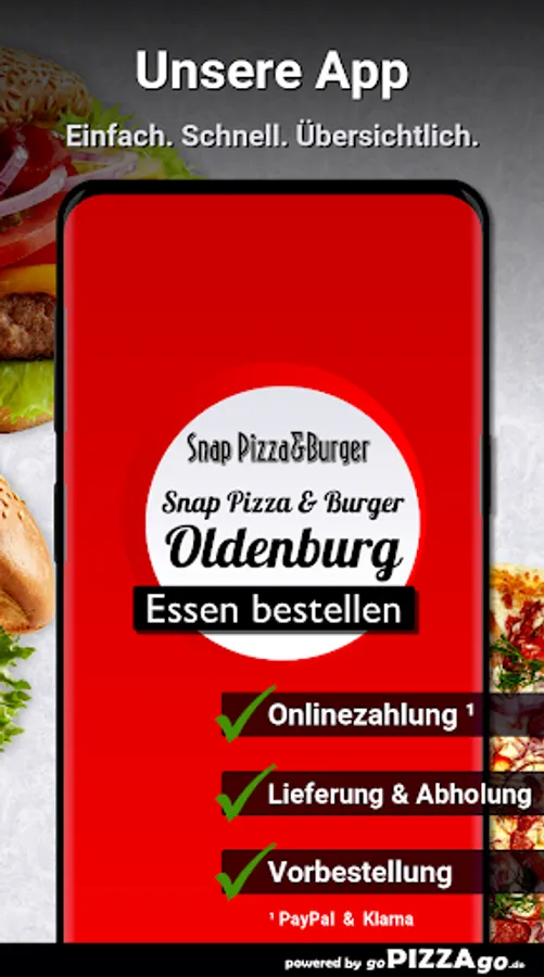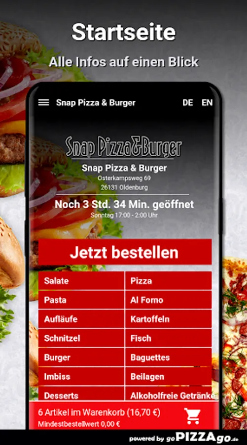 You can easily order delicious pizzas online at Snap Pizza & Burger in Oldenburg26 pizzas with your friends at Snap Pizza & Burger. Pizza Texas from 8.90-14.90 €, crispy pizza sunrise, pizza calzone is delivered at a price of 8.90-14.90 euros. Absolutely crispy Pizza Pomodoro is offered here online for only 8.50-14.50 euros for delivery, as well as Pizza Tuna is delivered at a price of 8.90-14.90 €.