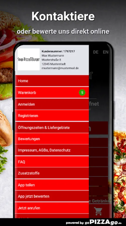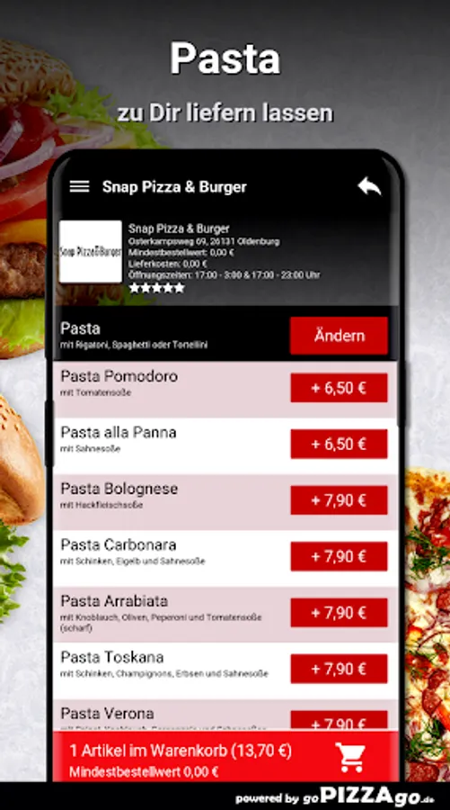 We invite you and friends to Snap Pizza & Burger on an appetizing journey through the diverse cuisine of Italy. If you have a craving for pizza & pasta, you've come to the right place with our delicious online offer of 40 delicacies from Italian cuisine. At Snap Pizza & Burger you can get aromatic, tasty Pizza Pomodoro delivered quickly to your place of residence for €8.50-14.50, Pizza Funghi delivered to your home, Pasta Mahari will be delivered to your front door by the delivery service for €7.90 , Pasta Verona, Pizza Texas 8.90-14.90 € or Pizza Curry Chicken brings you the delivery service at a price of 8.90-14.90 euros.