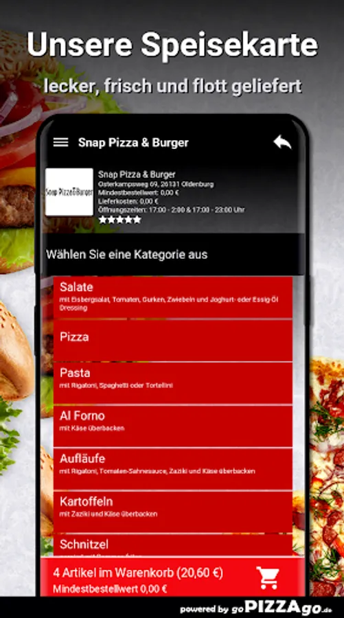 Order potatoes, schnitzel, burgers online at Snap Pizza & Burger With us you can also order casseroles, schnitzels, potatoes, burgers, salads, pizza, baguettes online!