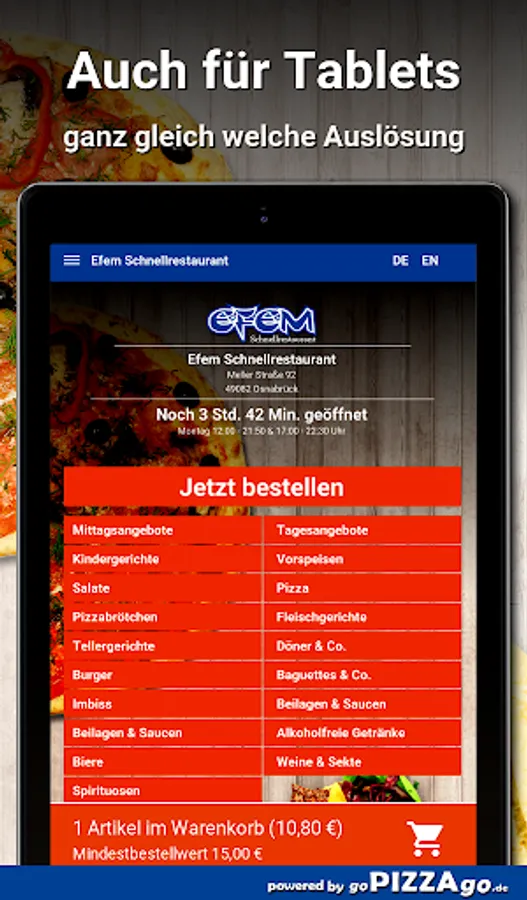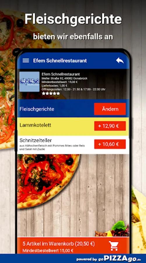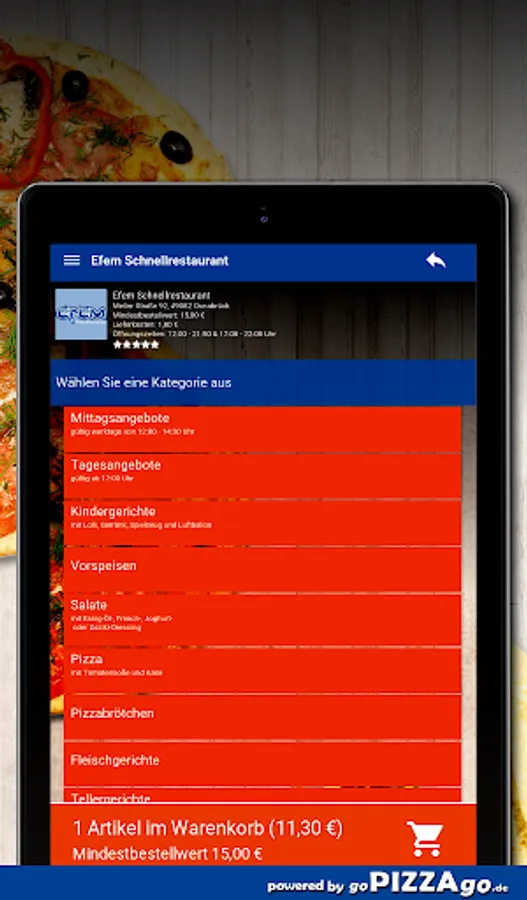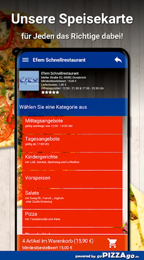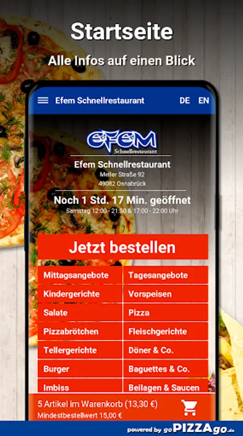 Willkommen bei Efem Schnellrestaurant in OsnabrückHaben Sie Lust auf Vorspeisen, Fleischgerichte, Pizza, Tellergerichte, Baguettes & Co., Pizzabrötchen zum online ordern?